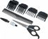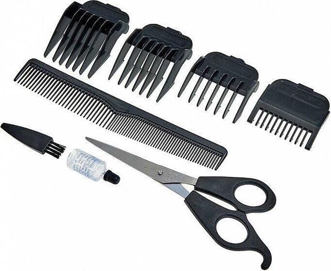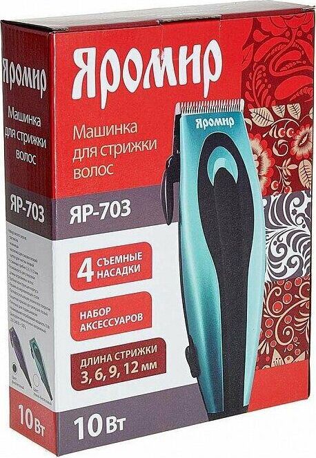Номинальная потребляемая мощность 10 Вт. Электропитание от сети 220В - 50Гц. Машинка используется для стрижки натуральных волос и предназначена для бытового и аналогичного применения. Цвет: темно-бирюзовый с черным. Вставка на корпусе с противоскользящим покрытием. Удобная конструкция корпуса. Лезвия из нержавеющей стали. Регулировка длины срезаемых волос. Четыре съёмных гребня: 3, 6, 9, 12 мм. Защитная крышка для режущих лезвий. Защитное приспособление для шнура. Расческа. Ножницы. Масленка для смазки лезвий. Щетка для чистки лезвий.