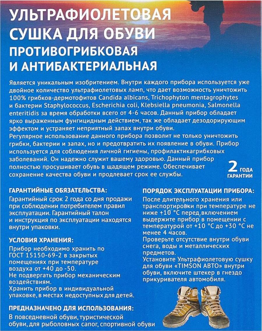 Сушилка работает от прикуривателя. Удобно использовать в поездках, путешествиях. Сухая обувь при любой погоде. Сушилка обеспечивает надежную противогрибковую и антибактериальную защиту обуви. Полностью просушивает обувь теплым воздухом при температуре не более +60°С - +70°С.