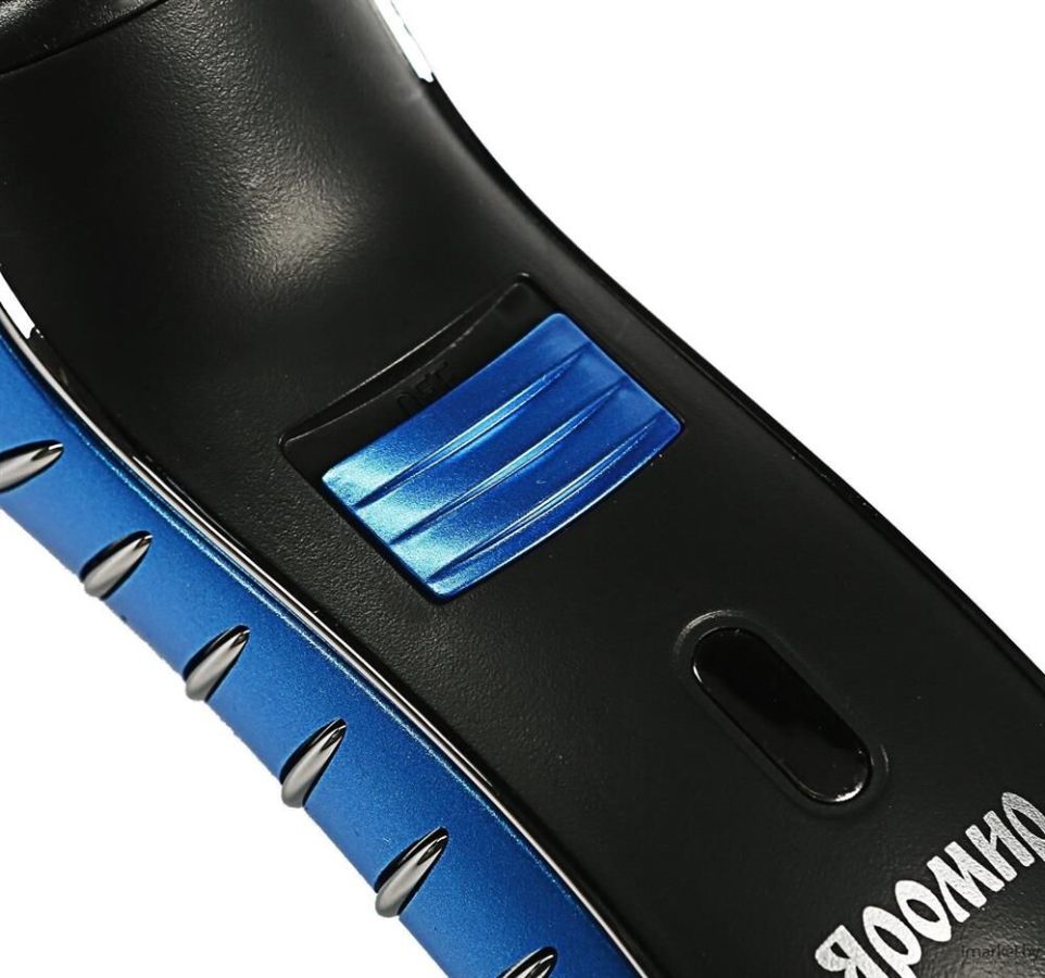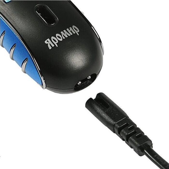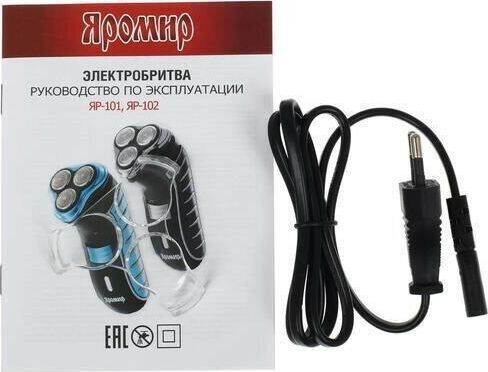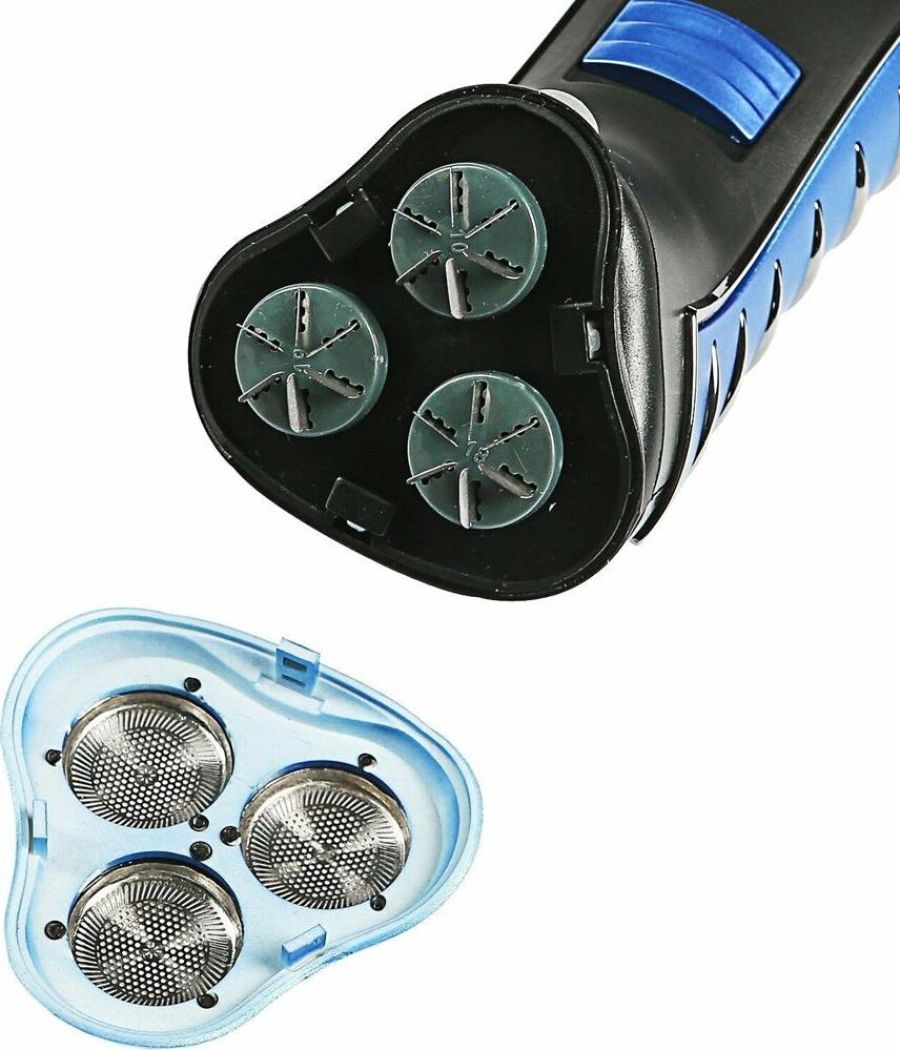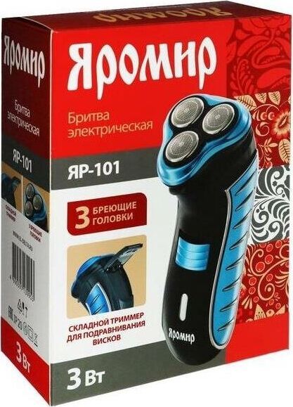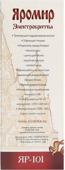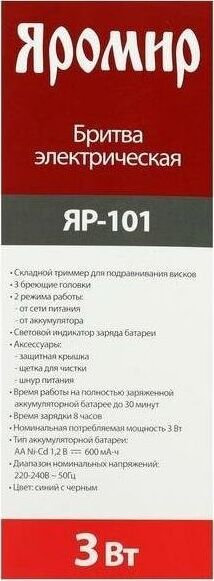 Мощность 3 Вт. Напряжение 1,2 В. Время работы на полностью заряженной аккумуляторной батарее 30 мин. Время зарядки 8 часов. 3 бреющие головки. Встроенный триммер для подравнивания висков. Электропитание от аккумуляторной батареи: Ni-Cd аккумулятор. Индикатор заряда батареи. Цвет: синий с черным. Аксессуары: Щетка для чистки, Защитная крышка, Сетевой шнур.
