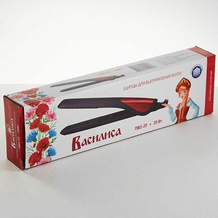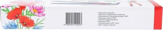 Макс. мощность 25 Вт. Макс. температура нагрева 180°С. Корпус из термостойкого пластика. Пластины с керамич. покрытием. Плоский нагреват. элемент, обеспечивающий равномерный нагрев пластин. Свет. индикатор работы. Цвет черный с красным.