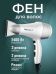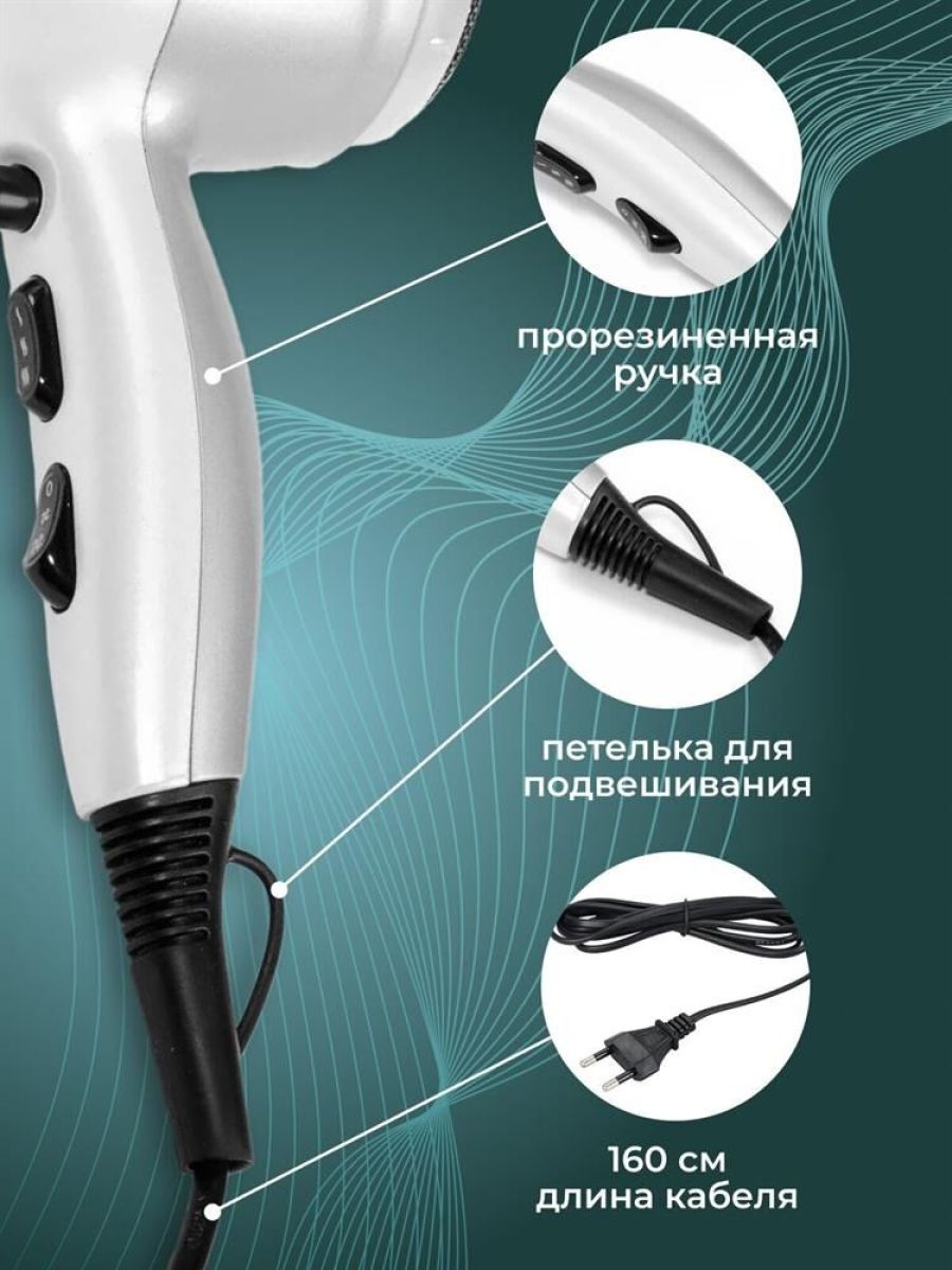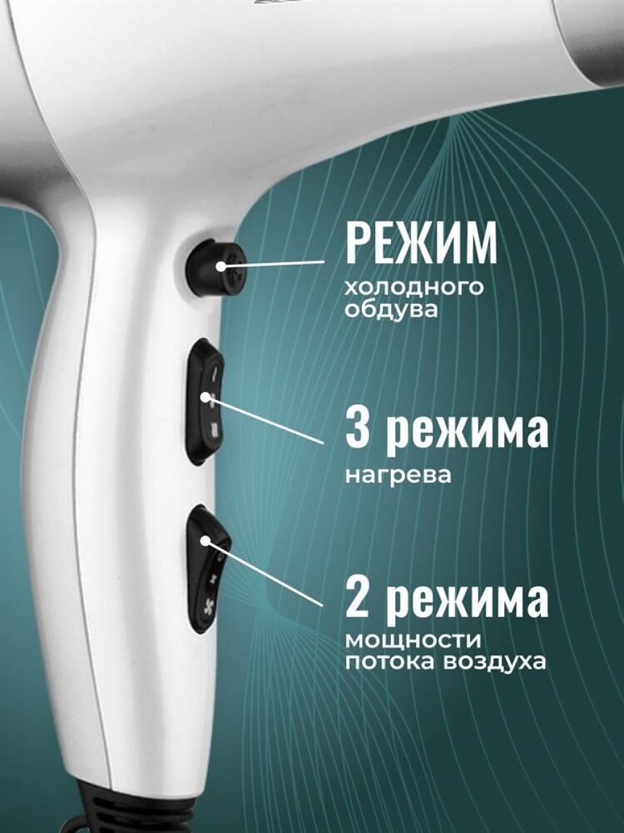 Мощность 2000Вт. 3 режима нагрева и 2 режима мощности потока воздуха. Холодный обдув для фиксации прически. Концентратор д/сушки и моделирования. Фильтр воздухозаборника. Петелька для подвешивания. Прорезиненная ручка.