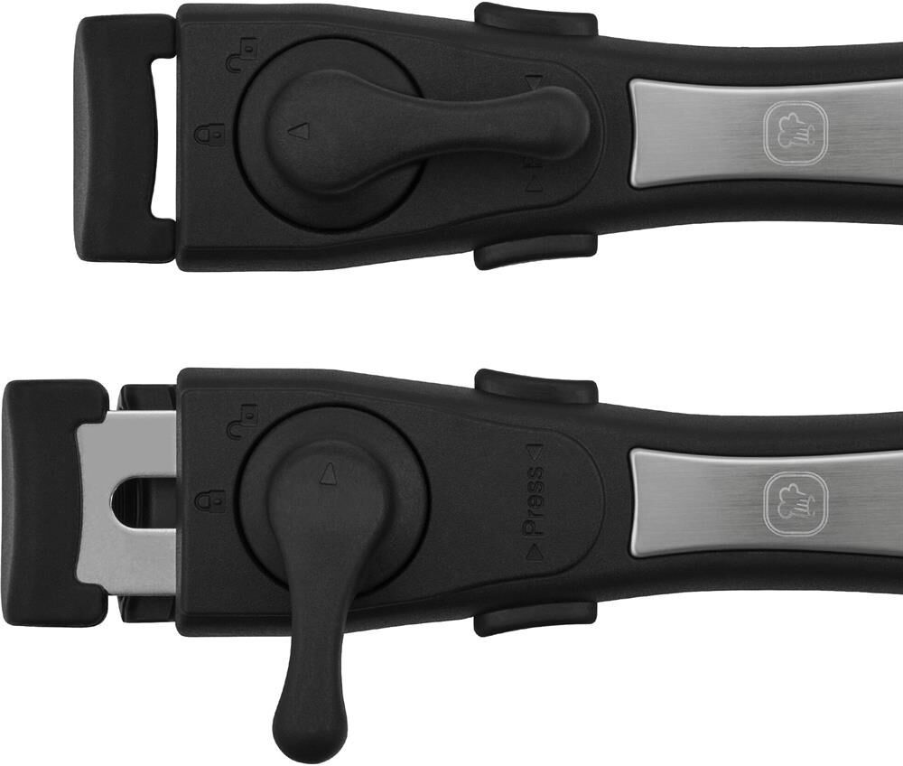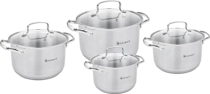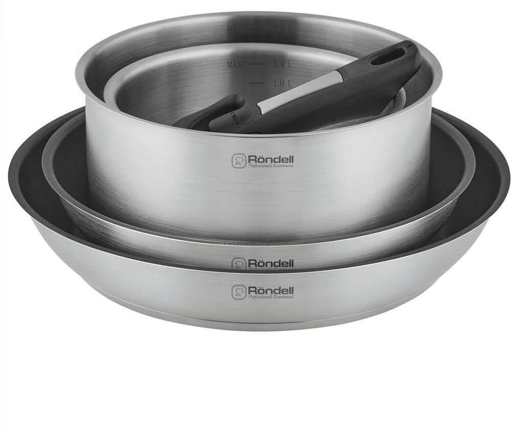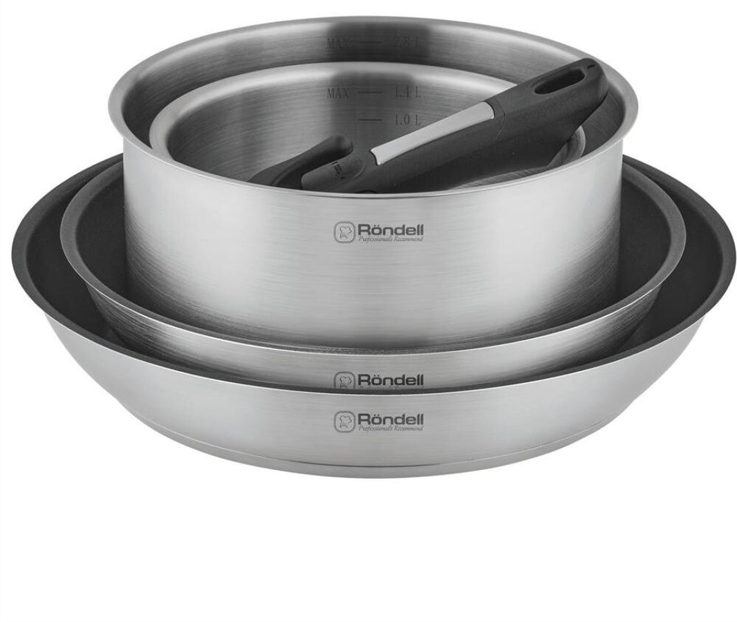 Наборы посуды из 5 предметов ( без крышек). Материал: нержавеющая сталь, материал ручки: бакелит, Сковородки с антипригарным покрытием. Комплектация: Кастрюля без крышки 16 см (1,4 л), Ковш без крышки 20 см (2,8 л), Сковорода 26 см, Сковорода 28 см, Съемная ручка.