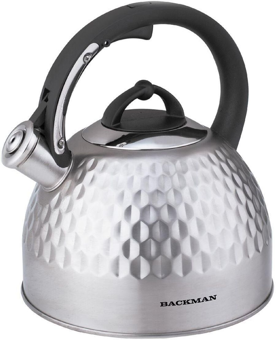 Чайник со свистком BACKMAN BM-0721 3,0 л , Чайник со свистком, 3,0 л, нержавеющая сталь,индукционное дно, курковый механизм, матовая полировка корпуса, фиксированная комбинированная ручка.