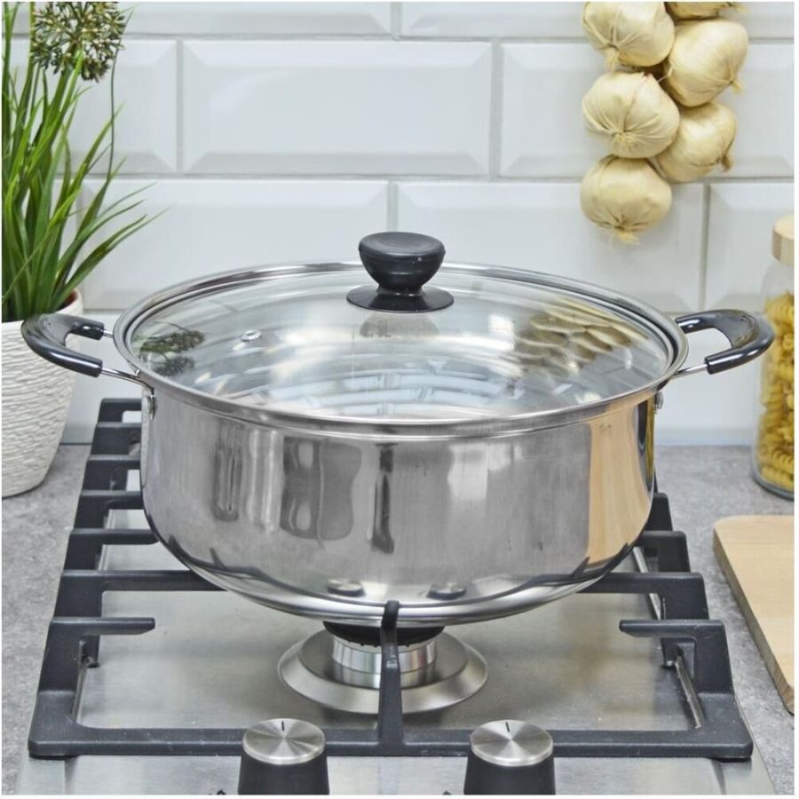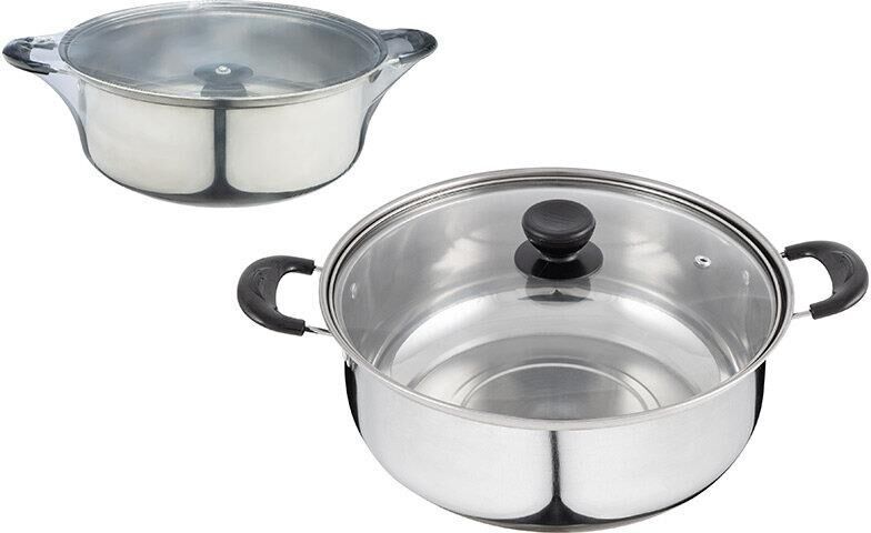 Кастрюля Promo, объем 3.6 л, из нержавеющей стали с крышкой из жаропрочного стекла. Материал: нерж сталь, жаропрочное стекло, нейлон. толщина стенок 0,3 мм, объем 3,6 л. Размер: 25,5 (диаметр)*10 (высота без крышки) см. Размер с ручками: 34 см. Высота с крышкой: 14,5 см. Дно однослойное. Подходит для всех типов плит. Не рекомендуется мыть в посудомоечной машине. Зеркальная полировка корпуса внутри и снаружи. Отметки литража. Крышка из жаропрочного стекла С-типа с отверстием для выпуска пара. Ручки: нерж сталь+ нейлон. Упаковка: стикер+термоусадочная пленка.