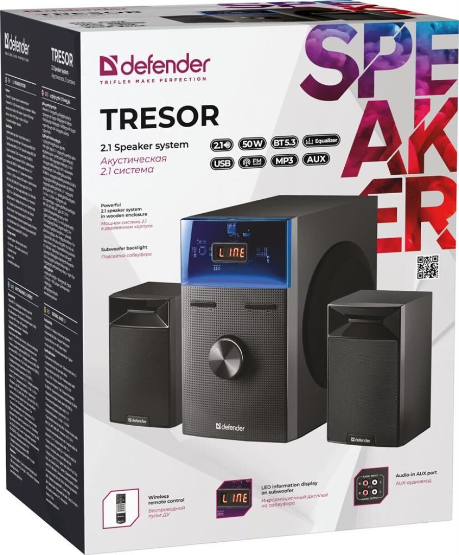 Акустическая система, Суммарная выходная мощность (RMS) 50 Вт Соотношение сигнал/шум 75 дБ Диапазон частот 50—20000 Гц Диапазон частот сабвуфера 50—260 Гц Диапазон частот сателлитов 260—20000 Гц Звуковая схема 2.1, стерео, Интерфейс беспроводной связи Bluetooth 5.3 Дальность действия 10 м Дисплей LED Пульт ДУ беспроводной Подсветка светодиодная Световые эффекты есть Количество световых режимов 4 Функция выключения подсветки есть Питание 230 В / 50 Гц.