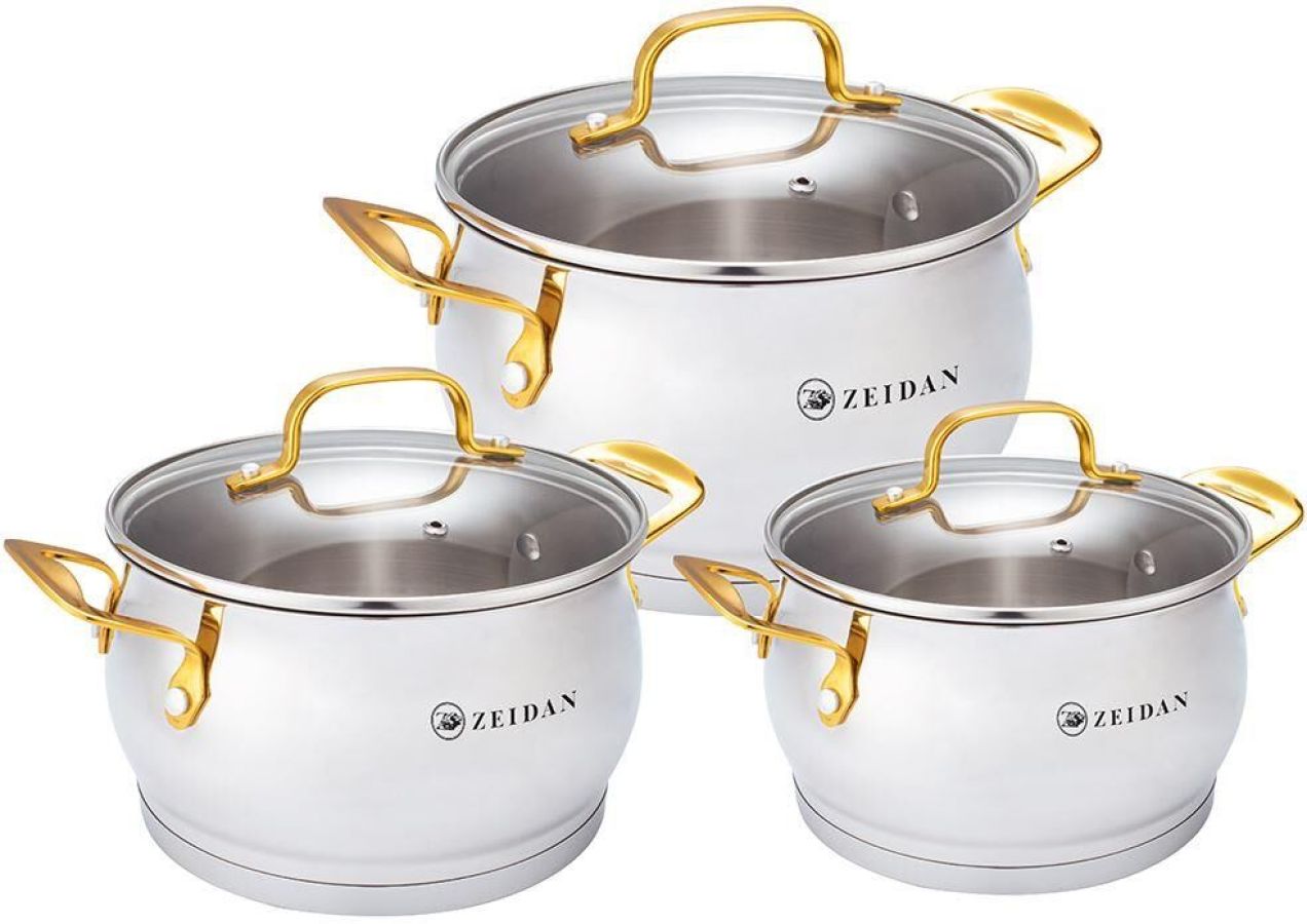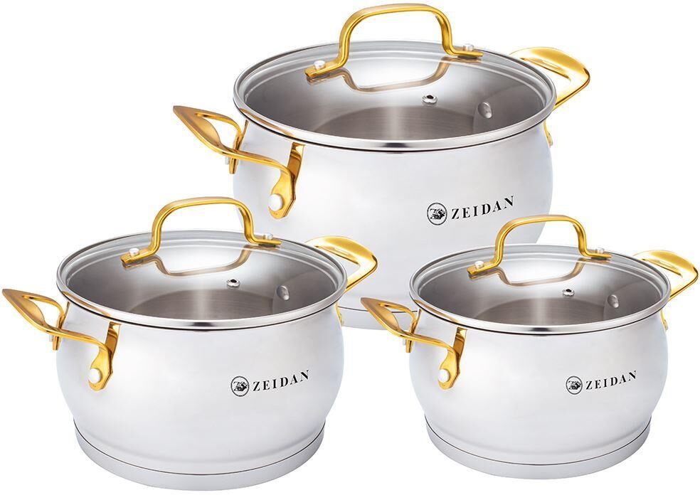 Набор посуды, 6 предм. (3 КАСТРЮЛИ С КРЫШКАМИ: 2.0 Л (d16 см ), 3.0 Л (d18 см ), 4.0 Л (d20 см ), нержавеющая сталь, 3-х СЛОЙНОЕ КАПСУЛИРОВАННОЕ ДНО, крышки - стекло, ручки «под золото», внутренняя - матовая полировка корпуса, снаружи – зеркальная полировка корпуса.