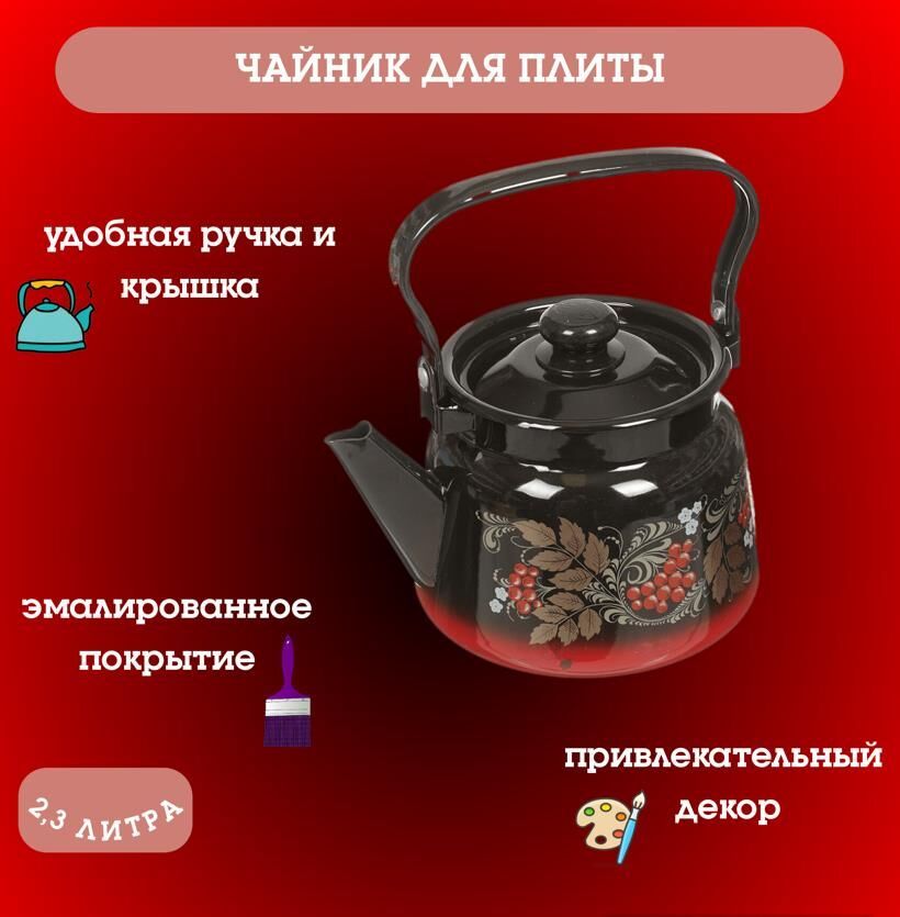 Чайник из эмалированной стали пригодится на каждой кухне: дома и на даче. Посуду торговой марки «Сибирские товары» отличают качества, которые сделают ее незаменимым помощником на долгие годы: быстрое распределение тепла по внутренней поверхности; стойкое, безопасное для пищевых продуктов и питьевой воды, эмалированное покрытие; удобная ручка и крышка; привлекательный декор. Рекомендуется применять неабразивные моющие средства. Избегайте ударов и падений посуды.