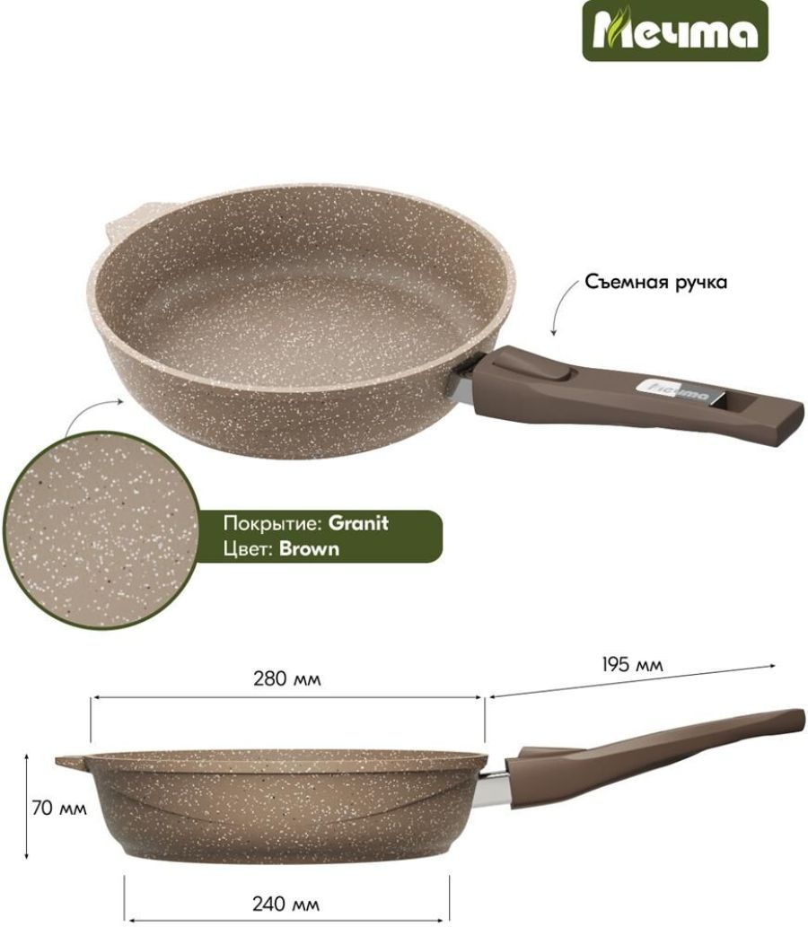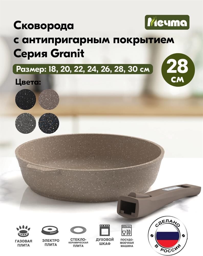 Сковорода 28 см. со съемной ручкой из бакелита. Антипригарным покрытием Greblon Rough на водной основе без PFOA. Серия "Гранит brown". Подходит для всех типов плит, кроме индукционных. Можно использовать в посудомоечной машине. Ресурс более 15 000 циклов, толщина покрытия до 55 мкр. Толщина дна 5,5-6мм., толщина стенок 3,6-4мм. Покрытие Greblon Rough позволяет готовить с минимальным количеством масла, сохраняя вкусовые и полезные свойства продуктов. Литой толстостенный корпус не подвержен деформации, а утолщенное дно равномерно распределяет тепло по всей поверхности.