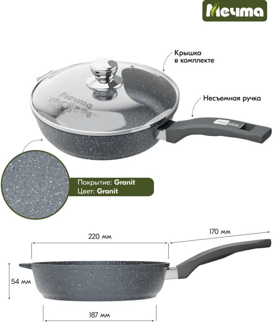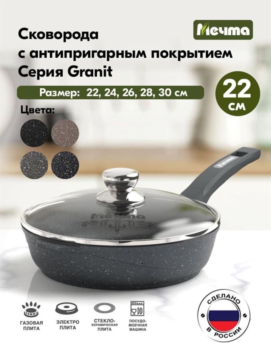 Сковорода 22 см. с несъемной ручкой из бакелита и стеклянной крышкой. Антипригарное покрытие Greblon Rough на водной основе без PFOA. Серия "Гранит". Подходит для всех типов плит, кроме индукционных. Можно использовать в посудомоечной машине. Ресурс более 15 000 циклов, толщина покрытия до 55 мкр. Толщина дна 5,5-6мм., толщина стенок 3,6-4мм. Покрытие Greblon позволяет готовить с минимальным количеством масла, сохраняя вкусовые и полезные свойства продуктов. Литой толстостенный корпус не подвержен деформации, а утолщенное дно равномерно распределяет тепло по всей поверхности.