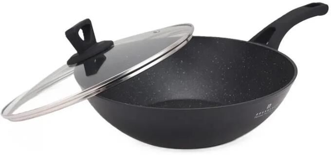 Сковорода Вок Со Стеклянной Крышкой Размер: - 28 см. (3,3 Лтр.) Материал: Литый Алюминий 3-Шаровое Мраморное Покрытие С мягкими силиконовыми ручками - Кнопка Крышка из огнеупорного стекла Внешний Корпус Термостойкий – Устойчивый к Высоким Температурам Подходит Для всех типов плит Турбо Индукционное Дно Подходит Для Посудомоечной Машины
