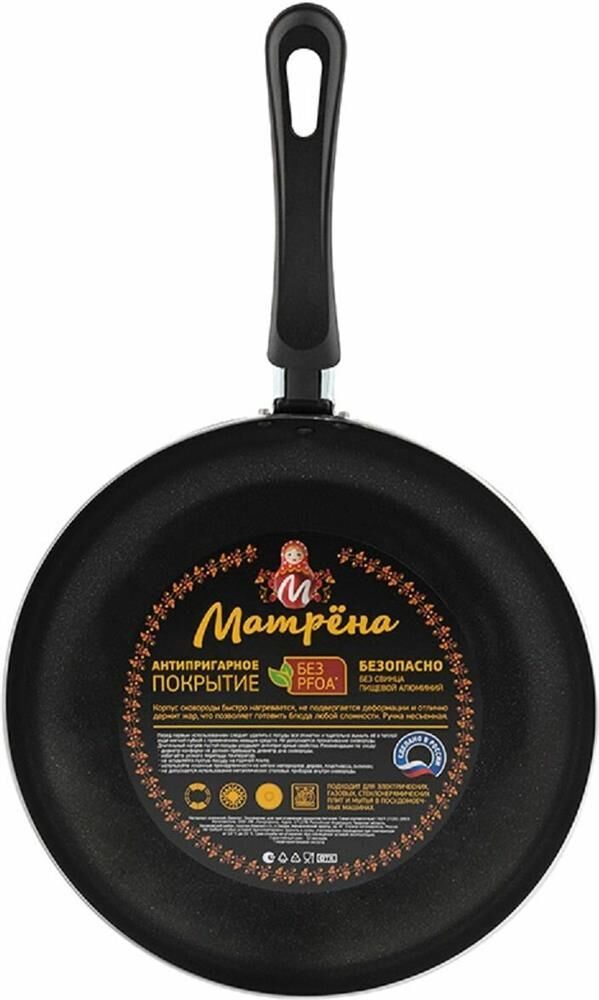Материал: алюминий, бакелит Размер: 44*28*4,5 см (диаметр 28 см) Толщина стенок и дна 1,5 мм Индивидуальная упаковка: термоусадочная пленка + цветной вкладыш + стикер Цвет: черный Не подходит для индукционной плиты. Антипригарное покрытие Scandia от PPG (ex. Whitford®) выдерживает высокие температуры и длительный нагрев. Корпус сковороды быстро нагревается, не подвергается деформации и отлично держит жар, что позволяет готовить блюда любой сложности. Подходит для мытья в посудомоечных машинах. Ручка несъемная. Хранить в сухом, отапливаемом помещении при температуре от 10°C до 25°C.