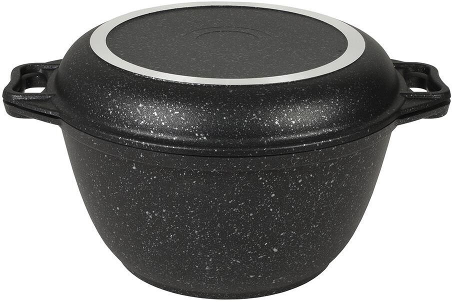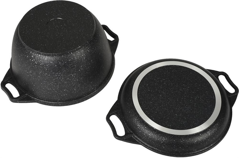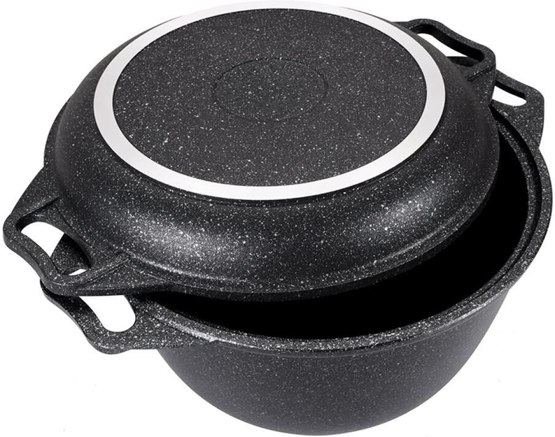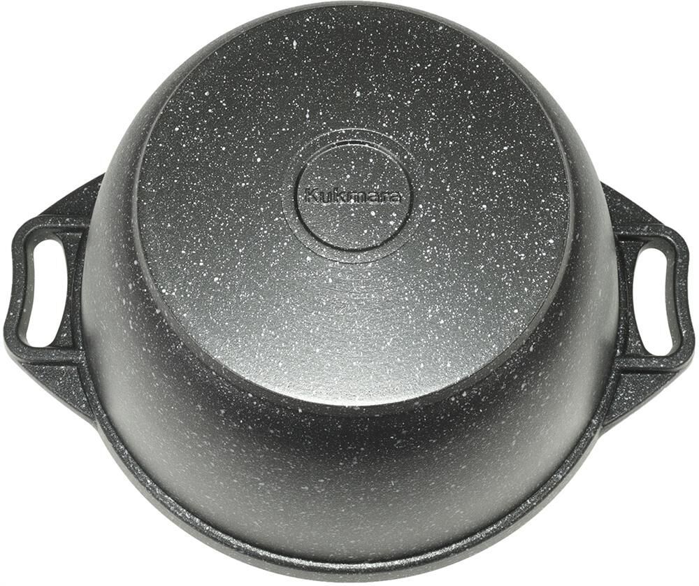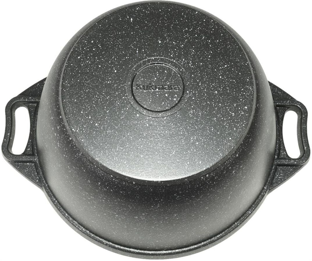 Казан с крышкой-сковородой " Kukmara" изготовлен из литого алюминия и покрыта инновационным антипригарным мраморным покрытием нового поколения на водной основе, усиленным сверхтвердыми частицами минералов. Особенности казана с крышкой-сковородой " Kukmara": значительная толщина стенок и дна исключает деформацию корпуса казана, гарантирует ее долговечность, обеспечивает необходимую прочность покрытия; высокопрочное антипригарное покрытие на водной основе, усиленное сверхпрочными минеральными