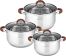 Набор из 6 предметов; Кастрюля 1,9л с крышкой, диаметр: 16см; Кастрюля 2,6л с крышкой, диаметр: 18см; Кастрюля 3,6л с крышкой, диаметр: 20см; Высококачественная нержавеющая сталь; Капсульное дно; Стеклянные крышки с паровыпуском; Удобные силиконовые ручки не нагреваются; Подходит для всех видов плит; Подходит для мытья в посудомоечной машине