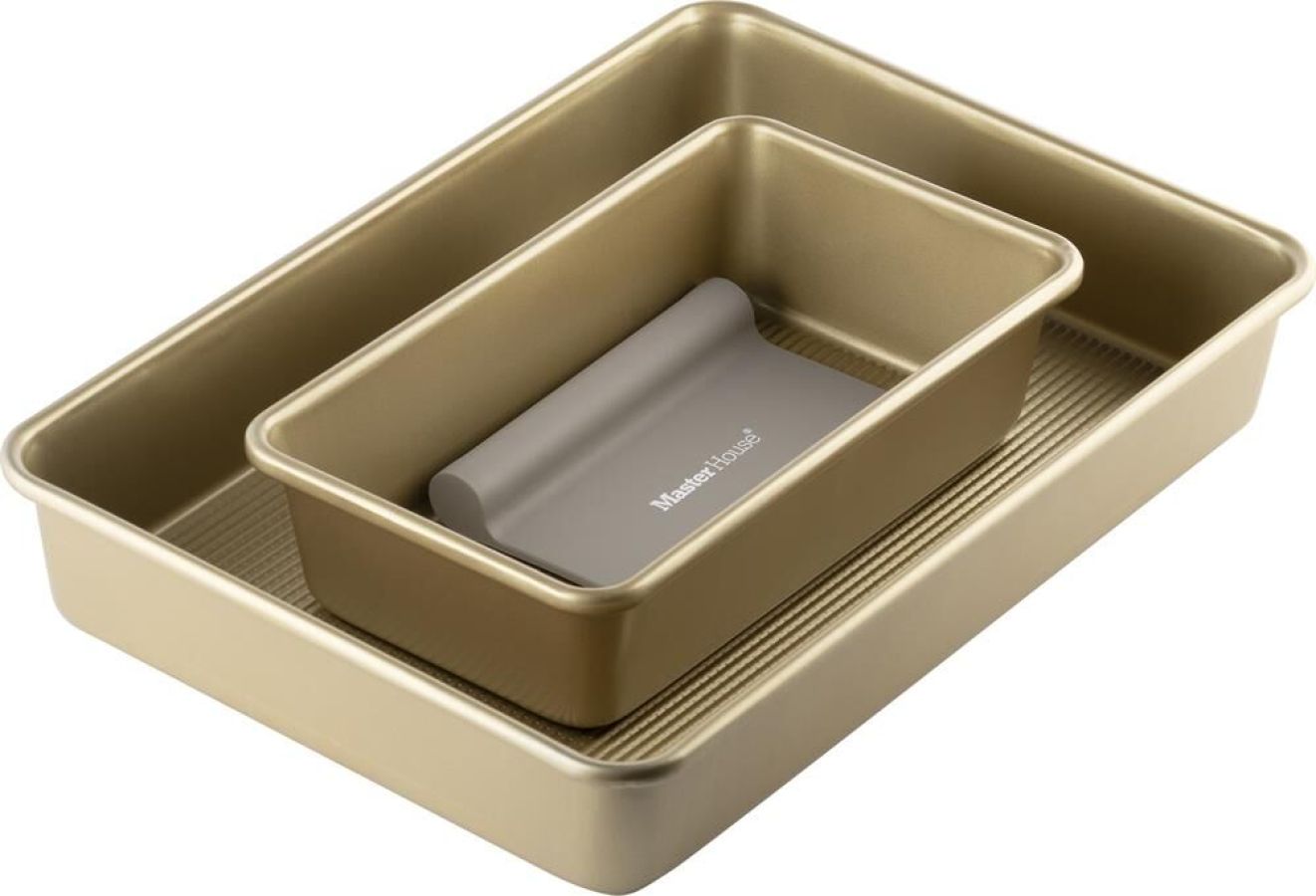 Внешний размер: 23,5 x 13,5 x 6 см., 34 x 23,5 x 6 см. В наборе кондитерский силиконовый шпатель. Материал Углеродистая сталь с антипригарным покрытием. Набор форм для выпечки (2 шт.) с силиконовым шпателем. Равномерный прогрев изделия. Улучшенное антипригарное покрытие GMM. Внешнее и внутреннее антипригарное покрытие для легкого ухода. Для продления срока службы рекомендуется мыть вручную. Для использования в духовке (max t° +230°C).