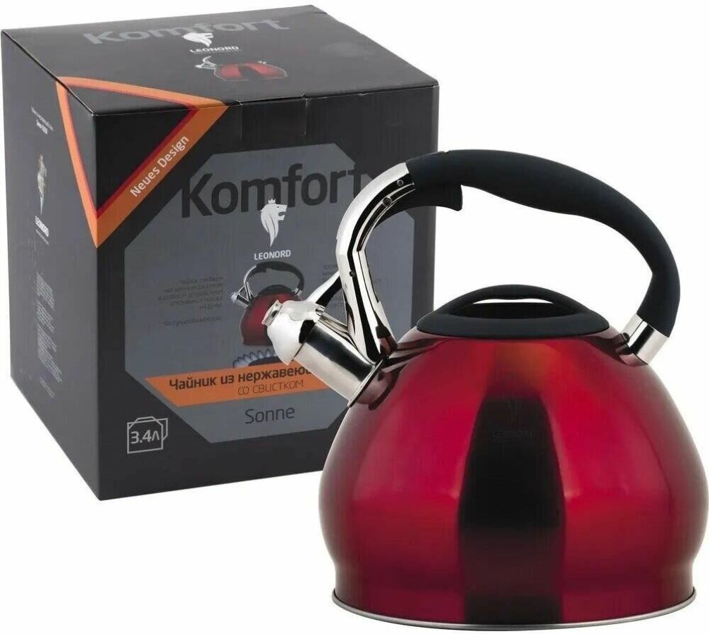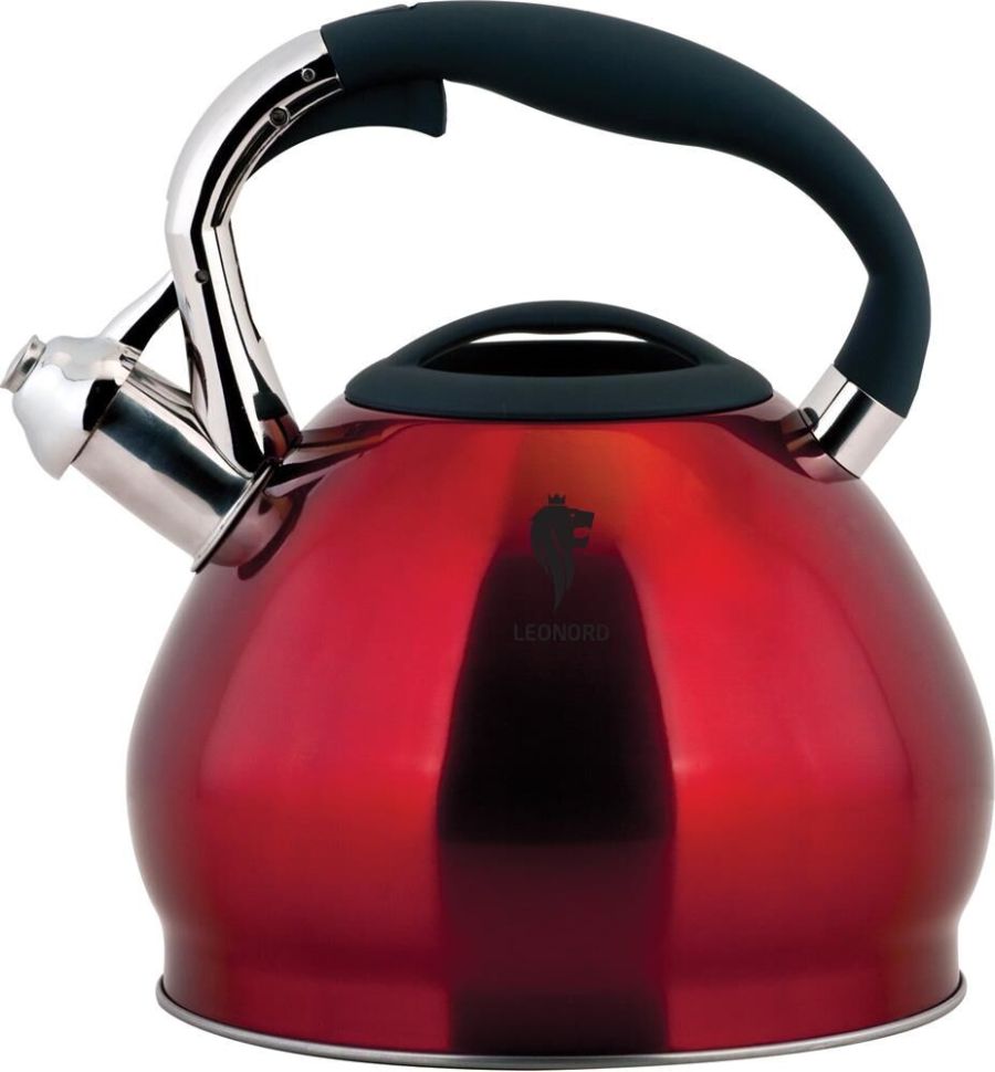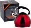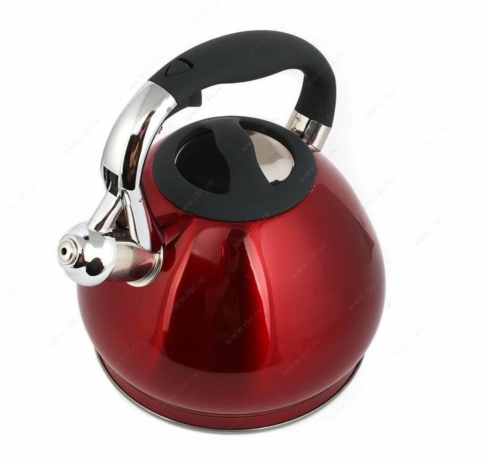 Чайник из нержавеющей стали со свистком Материалы - нерж сталь, сплав цинка, нейлон, силиконовое покрытие (ручка). Материал корпуса: высококачественная нержавеющая сталь, толщина 0,5 мм; Объем: 3.4 литра; Корпус: окрашенный, цвет - красный Прочная комбинированная ручка из сплава цинка и нейлона с покрытием из силикона. Капсулированное дно; Несъемный свисток; Подходит для всех типов плит; Упаковка: цветная картонная коробка/трансп упаковка 6 шт