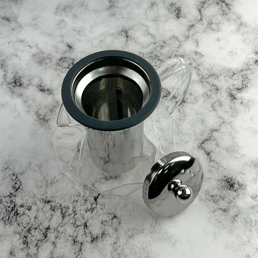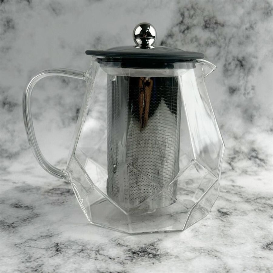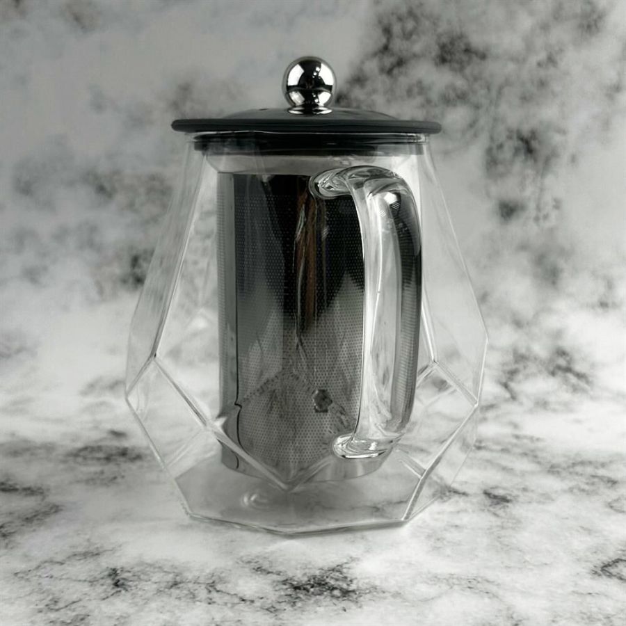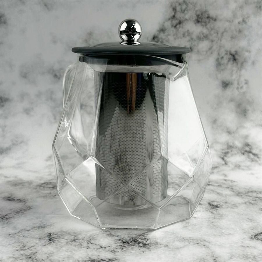 Чайник заварочный, AROMA, 820 мл из боросиликатного стекла, корпус с гранями Материал: термостойкое боросиликатное стекло, силикон, 304 нерж сталь. Объем: 820 мл. Усиленный фильтр из 304 стали. Силиконовая вставка на крышке из 304 стали. Отверстия для выпуска пара на крышке. Цвет силикона на выбор. Упаковка: пуз пленка + цв коробка+защитный пакет на крышке.