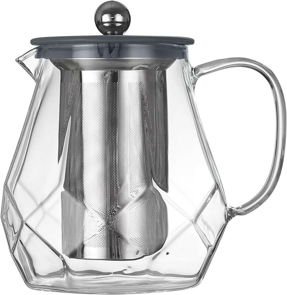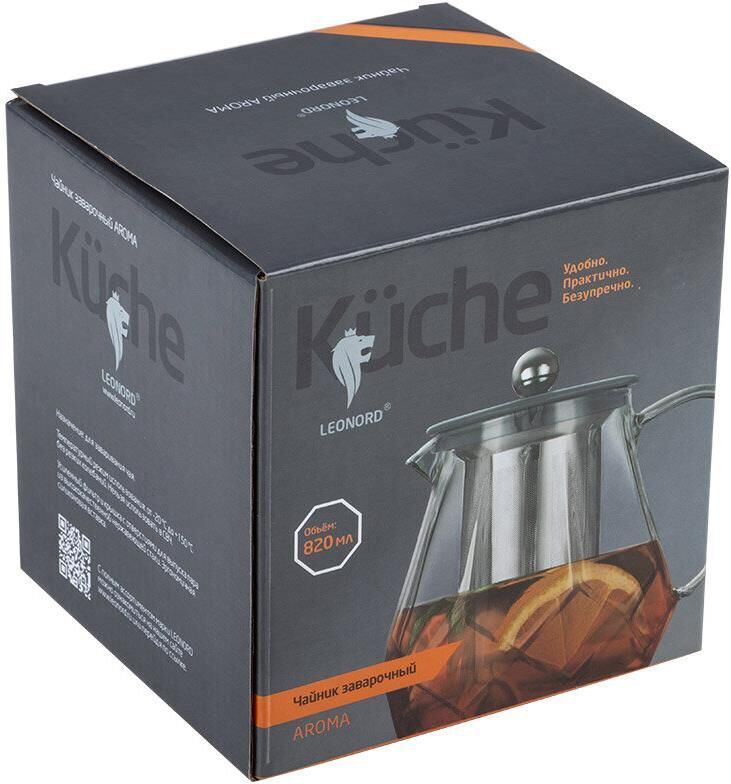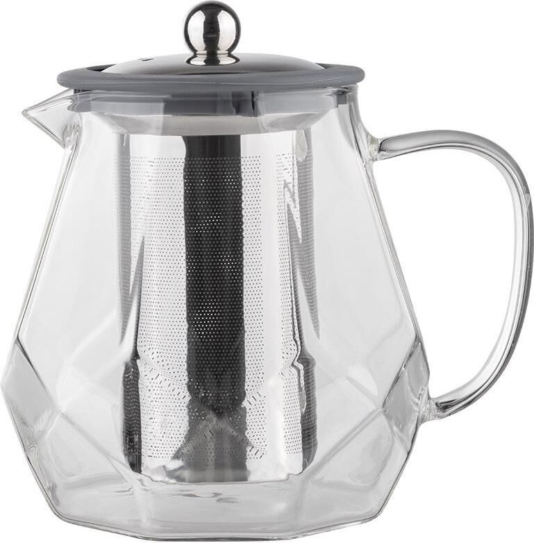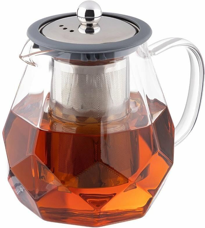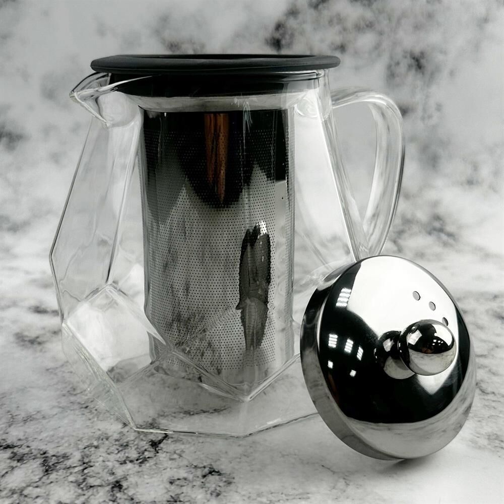 Чайник заварочный, AROMA, 820 мл из боросиликатного стекла, корпус с гранями Материал: термостойкое боросиликатное стекло, силикон, 304 нерж сталь. Объем: 820 мл. Усиленный фильтр из 304 стали. Силиконовая вставка на крышке из 304 стали. Отверстия для выпуска пара на крышке. Цвет силикона на выбор. Упаковка: пуз пленка + цв коробка+защитный пакет на крышке.