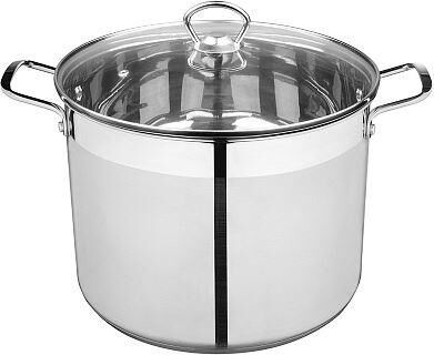 Кастрюля CULINARIA, объем 12,9 л, из нерж стали с крышкой из жаропрочного стекла Материал: нерж сталь, алюминий, железо, жаропрочное стекло. Объем: 12,9 л. Размер: 28*21 см. Толщина стенок: 0,5 мм. Дно 5-слойное капсулированное 3,5мм (0,5 мм алюминий + 1,5 мм железо +0,5 мм алюминий + сталь, база). Подходит для всех типов плит. Снаружи: смешанная (80% - матовая, 20% - зеркальная (верхняя часть)), внутри зеркальная полировка. Отметки литража. Крышка G-типа из жаропрочного стекла с отверстием для выпуска пара. Стальные витые ручки . Упаковка: термоусадка, цветной круглый вкладыш.