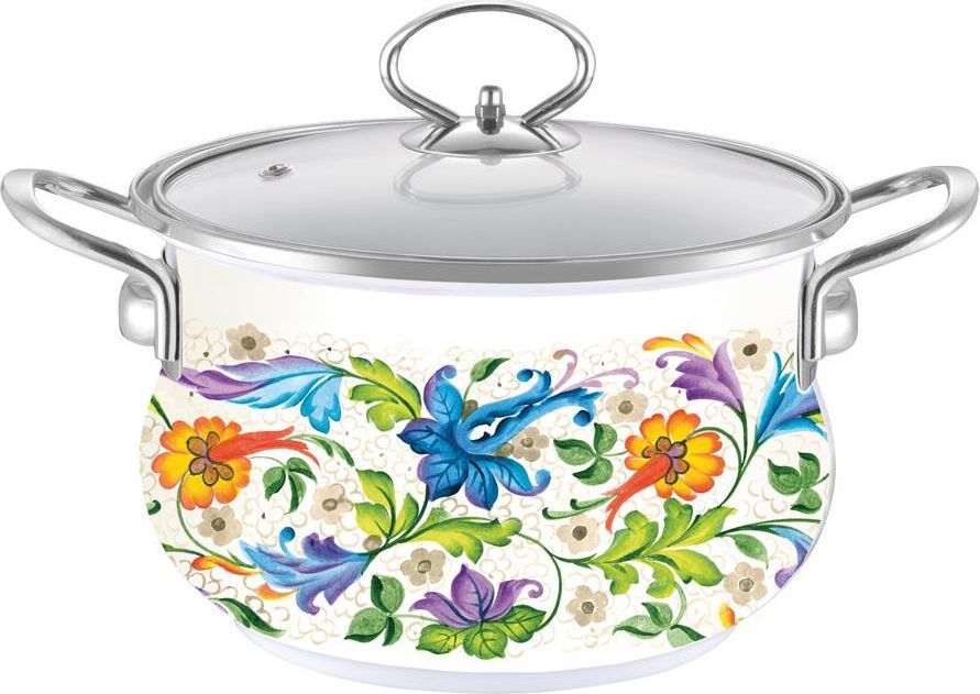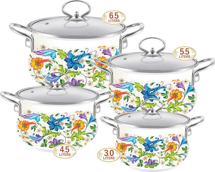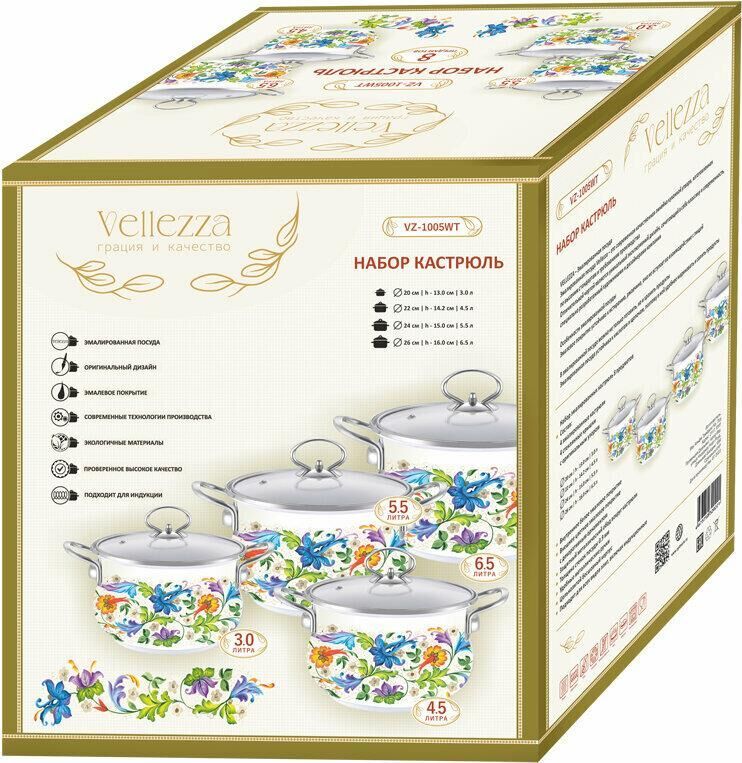 Набор кастрюль VELLEZZA WHITE 8 предметов: 4 эмалированные кастрюли 4 стеклянные крышки Размеры: Ø 20 | h-13.0 см | 3.0 л Ø 22 | h-14.2 см | 4.5 л Ø 24 | h-15.0 см | 5.5 л Ø 26 | h-16.0 см | 6.5 л Внутреннее белое эмалевое покрытие Внешнее цветное эмалевое покрытие с декоративным орнаментом Защитный металлический обод вокруг кастрюли Толщина стенок посуды 0.9 мм Ручки из нержавеющей стали Цельнолитой бесшовный корпус Подходит для всех видов плит, включая индукционные