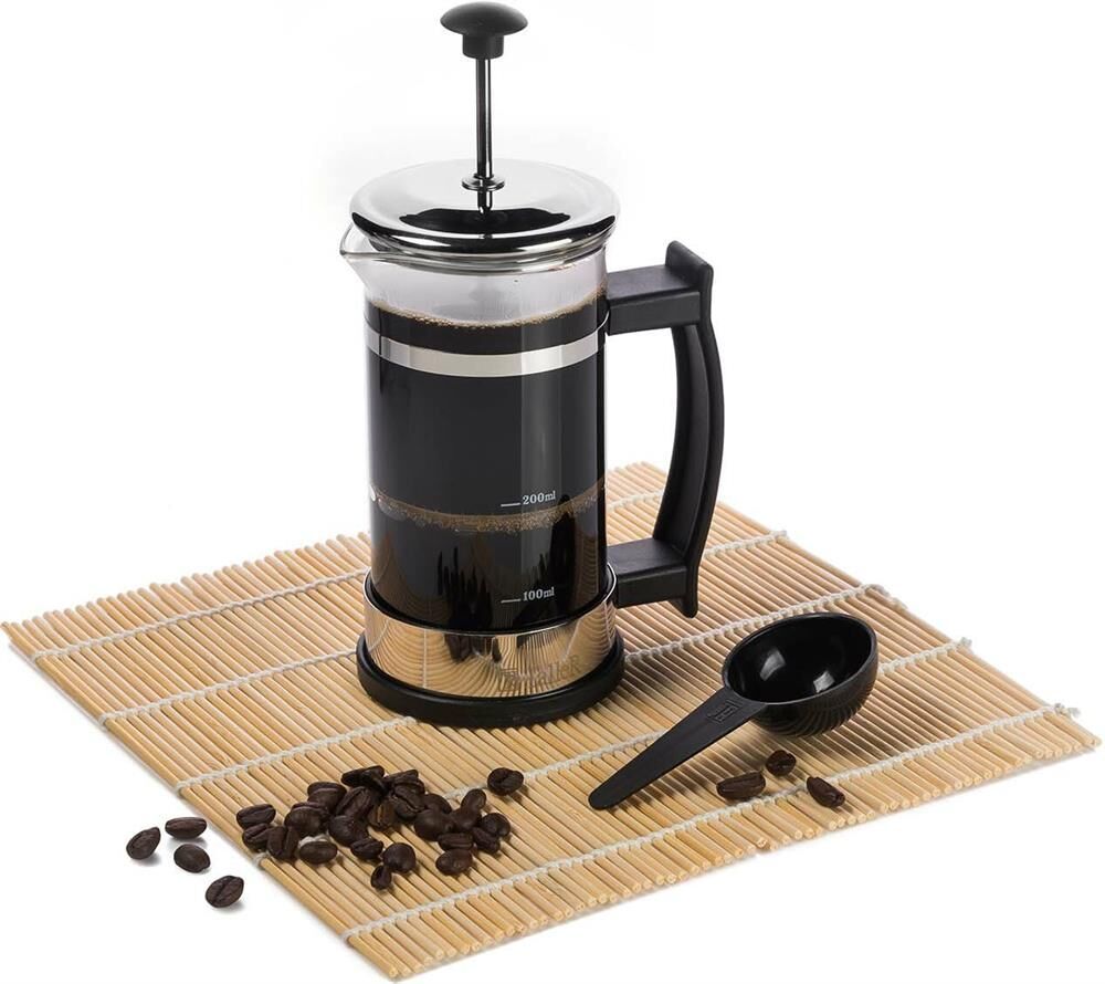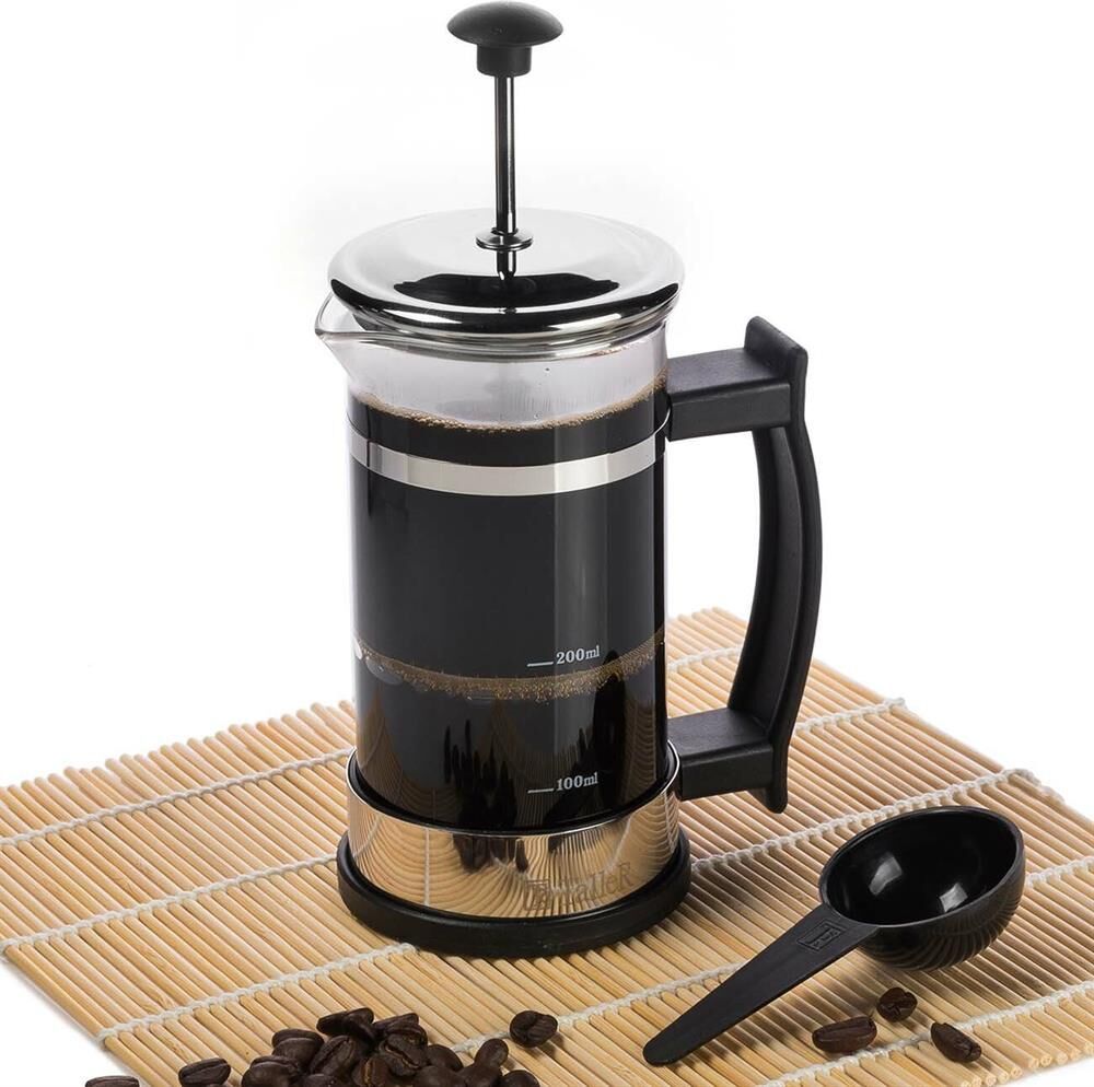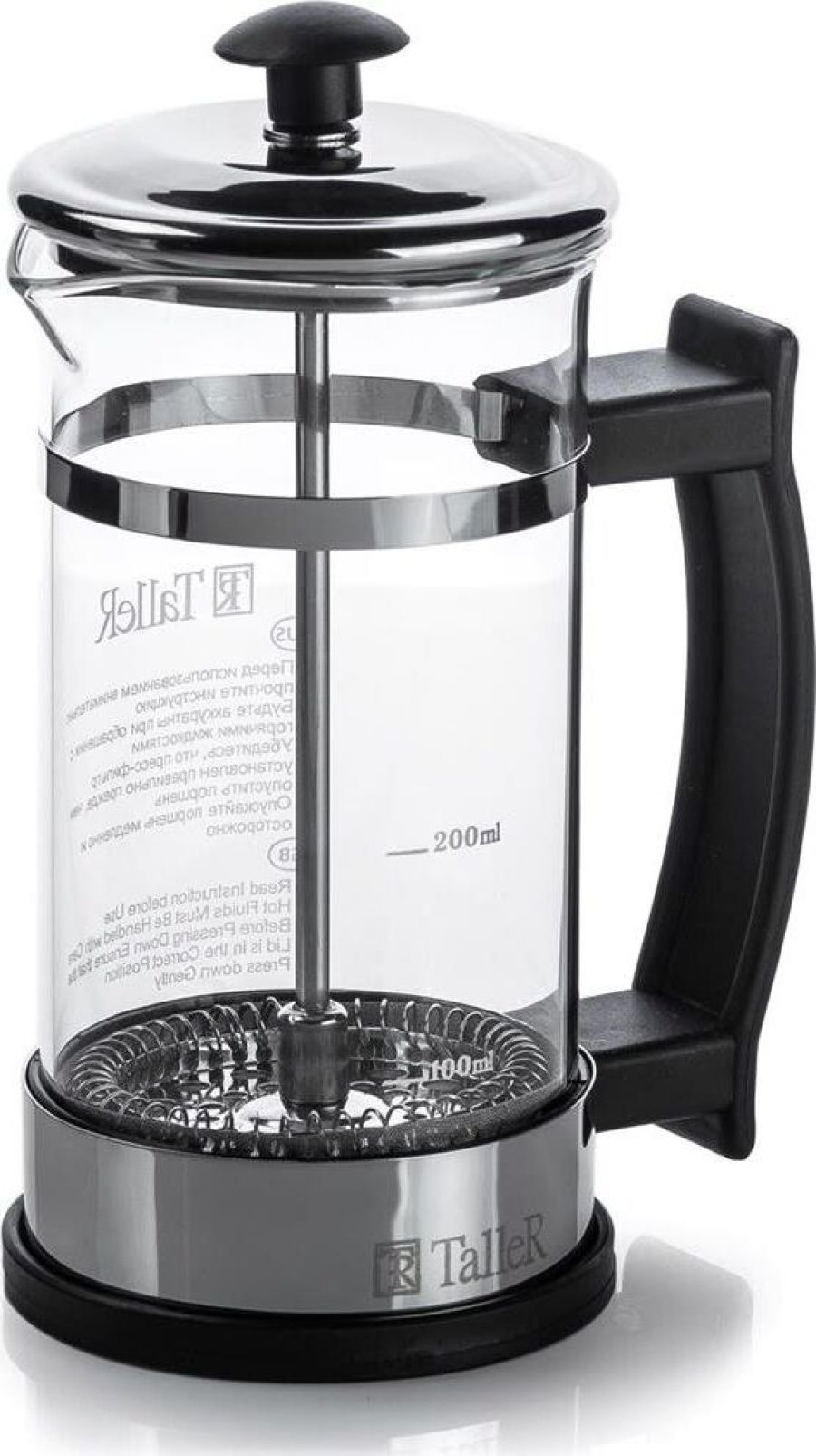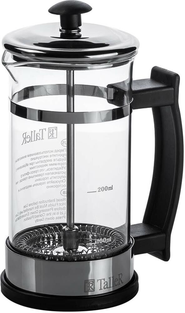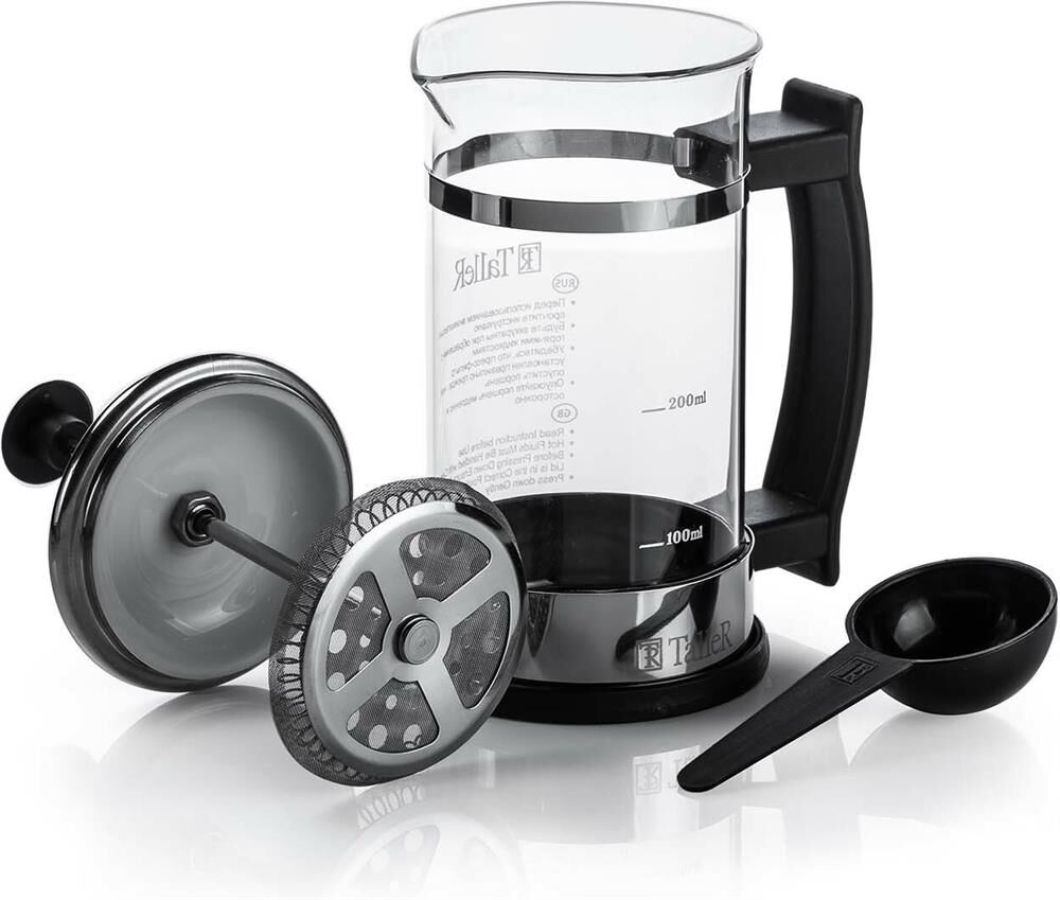 френч-пресс, объем - 350 мл, мерная ложка и буклет с рецептами. Материалы: боросиликатное стекло, высококачественная нержавеющая сталь Толщины: стекло - 2,0 мм, подстаканник - 0,8 мм, детали пресс-фильтра - 0,3 мм Пригоден для мытья в посудомоечной машине
