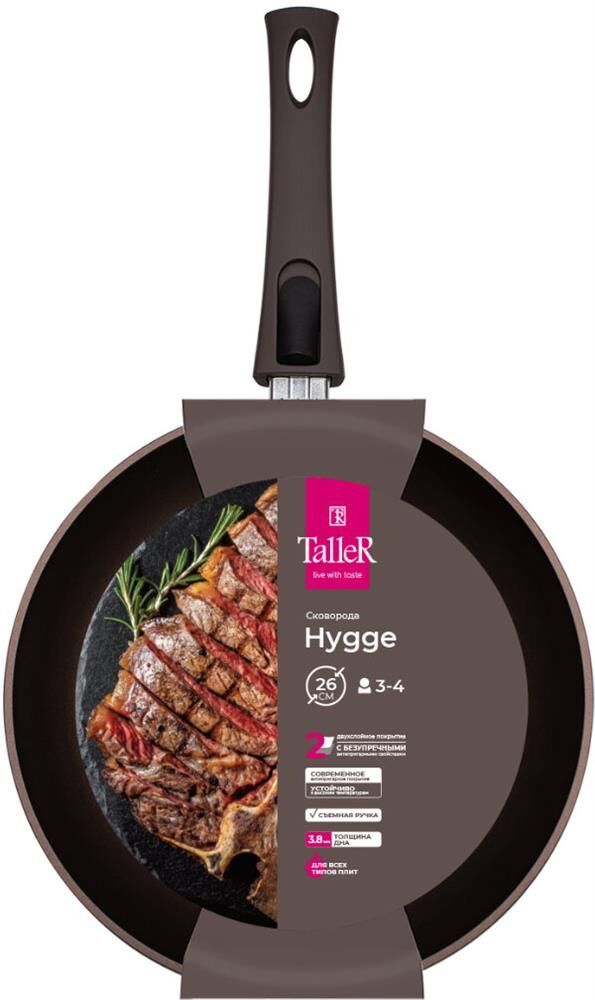 Сковорода Hygge, 26 см, с бакелитовой съемной ручкой. Материал: кованый алюминий, толщина дна 3,8 мм, толщина стенок 3,3 мм Высота 5,0 см внешний диаметр дна – 21.3 см Подходит для всех типов плит, включая индукционную. Рекомендовано ручное мытьё. Упаков