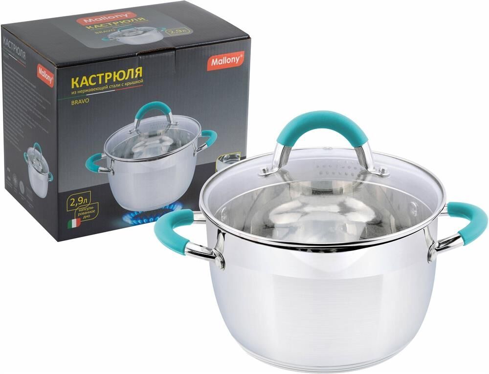 Кастрюля из нержавеющей стали с крышкой, объем: 2,9 л, размер 18*11,5 см, "Bravo", тм Mallony КРЫШКА с ДУРШЛАГОМ Высота стенки без крышки - 11,5 см Кастрюля из нержавеющей стали с крышкой, толщина стенок - 0,5 мм, капсулированное дно 5 слоев (0,5 мм нер