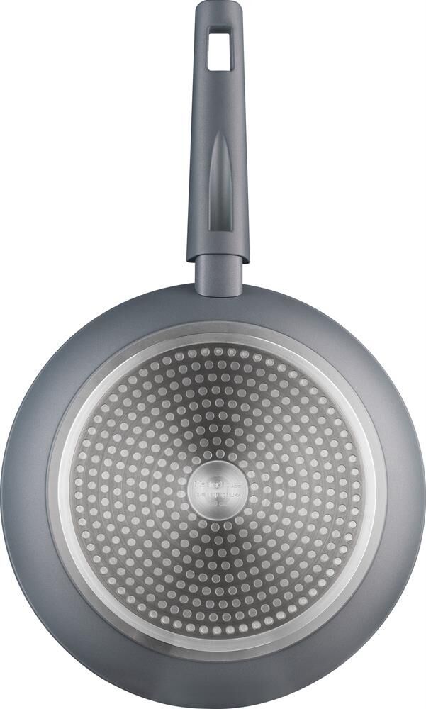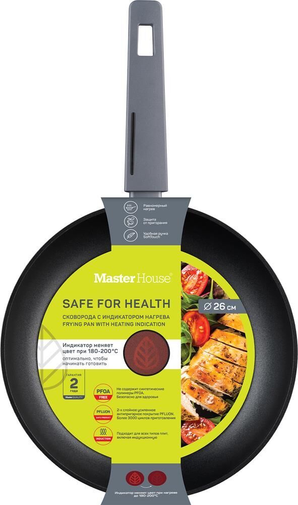 Сковорода. Кованый алюминий. Бакелитовая ручка с мягким напылением. Двухслойное антипригарное усиленное покрытие, стандарт Pfluon, 25-30мкр. С индикатором температуры. Диаметр по верху (крышка): 26см, высота бортика 5,0мм, толщина дна 3 мм. Выдерживает более 3000 циклов на истирание. Подходит для всех видов плит, в том числе для индукционной.