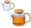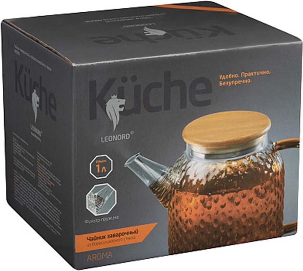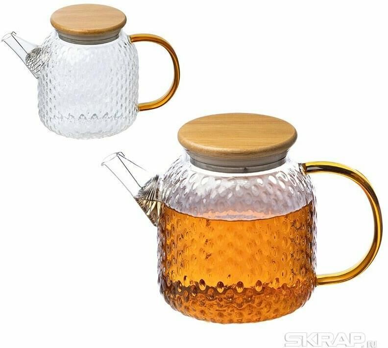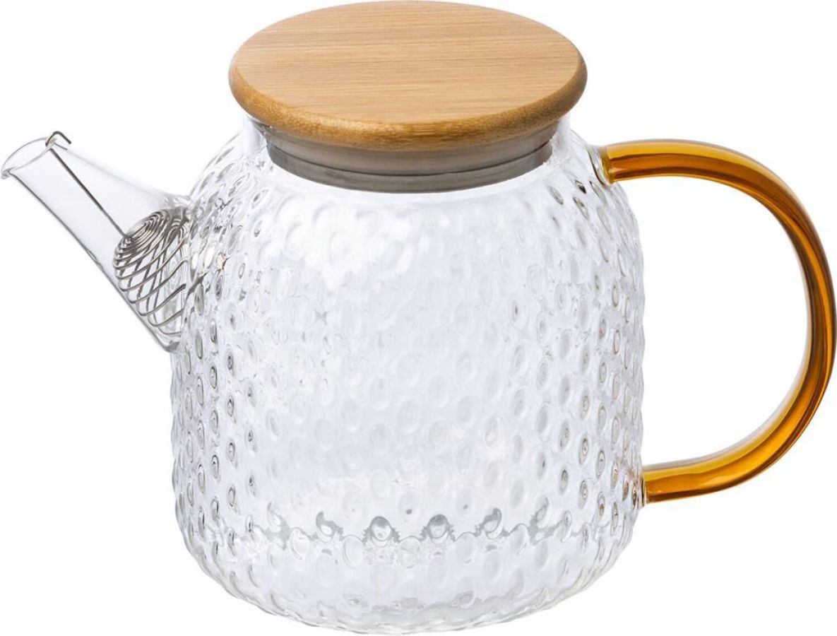 Чайник заварочный AROMA, объем 1 л, из боросиликатного стекла с рельефом, с крышкой из бамбука и ручкой из окрашенного стекла. Материал: высококачественное боросиликатное стекло, фильтр из 304 стали, крышка - бамбук/силикон/нерж сталь. Объем 1 л. Упаковка