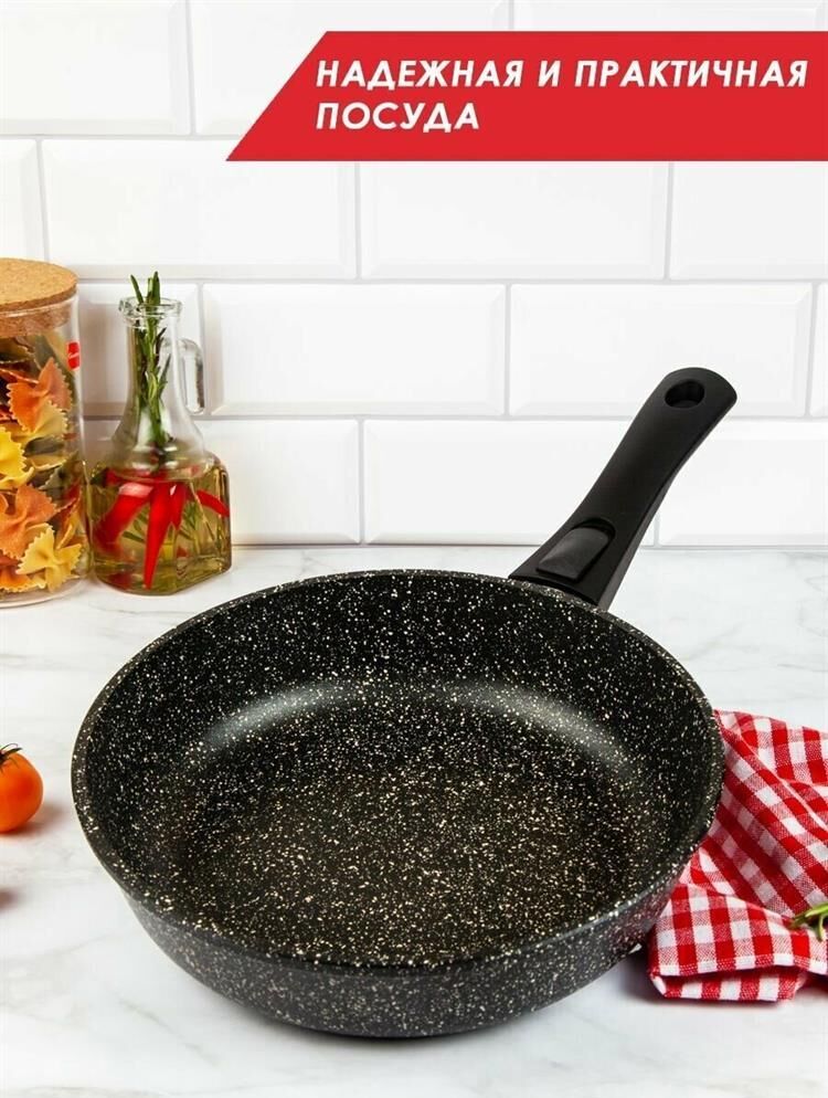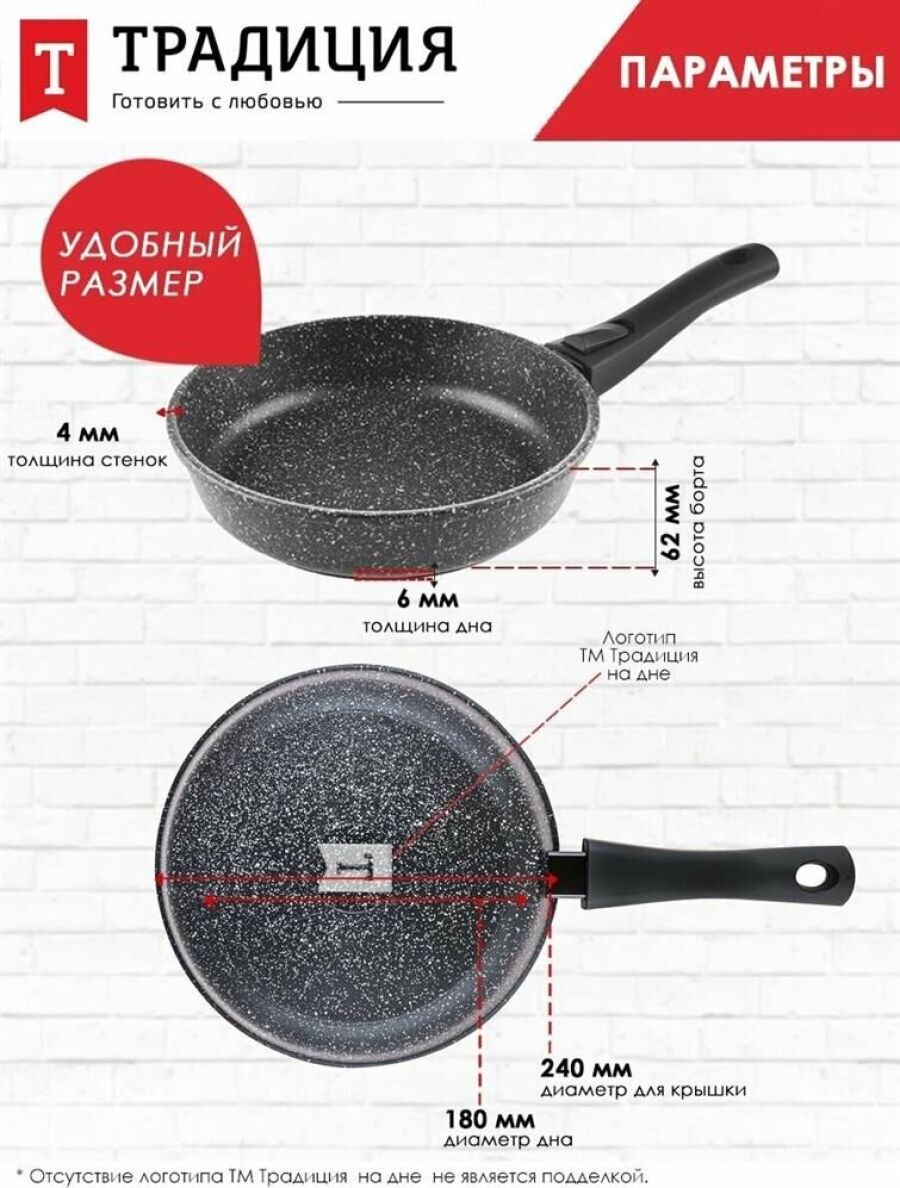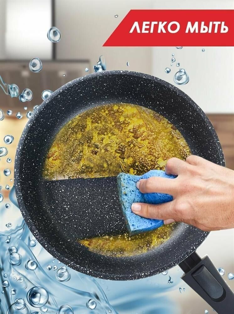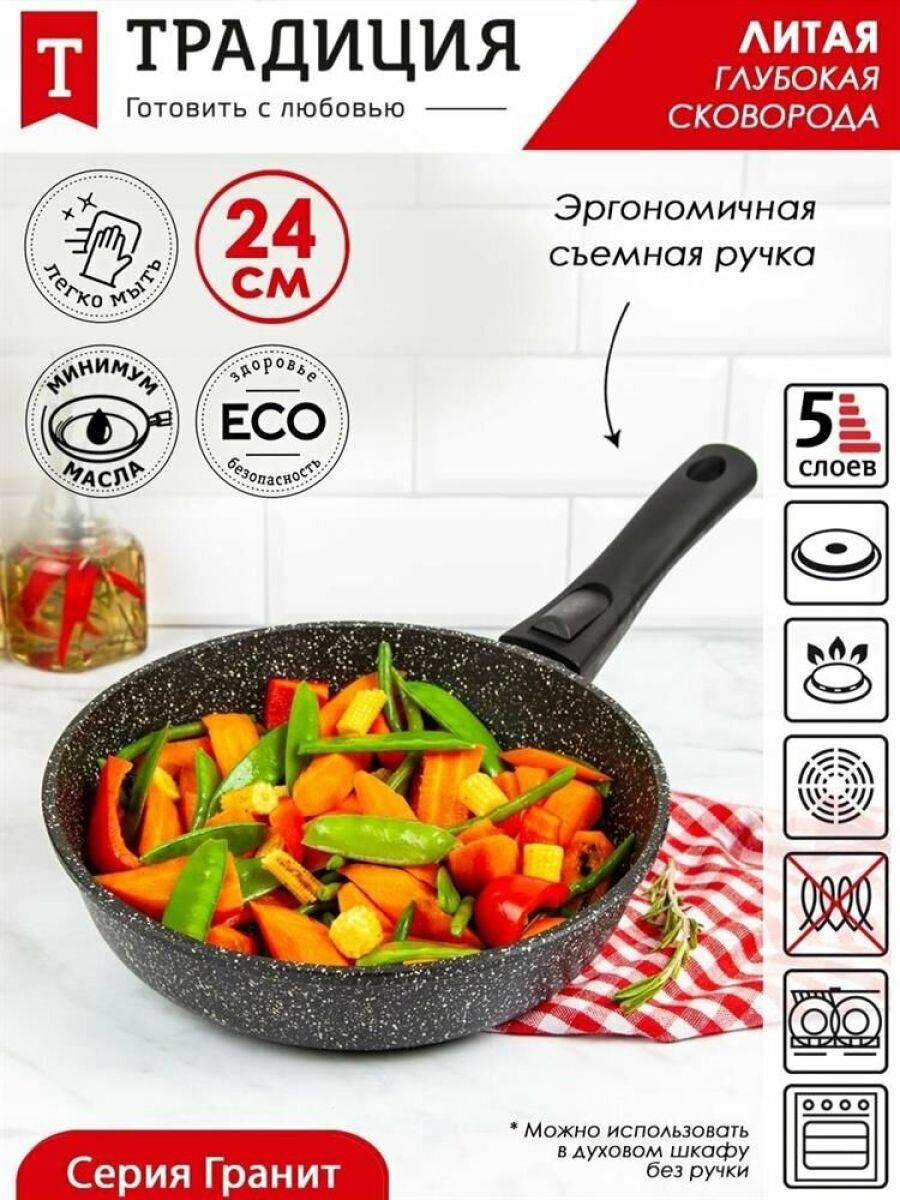 Усиленное 7-ми слойное антипригарное покрытие. Съемная ручка. Подходит для индукционных, стеклокерамических, газовых и электрических плит. Можно готовить без масла. Товар является экологически безопасным, т.к. при производстве не используется перфтороктановая кислота (PFOA), которая при готовке выделяет токсичные вещества в еду. Легкие царапины и небольшие потертости не ухудшают антипригарных свойств покрытия. Подходит для посудомоечной машины. Размер: 24 см Материал: литой алюминий Толщина дна: 3.5 Толщина стенок: 2.5