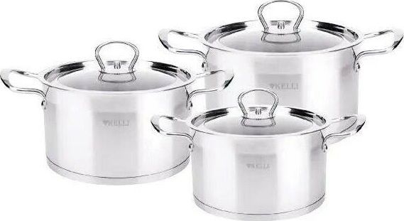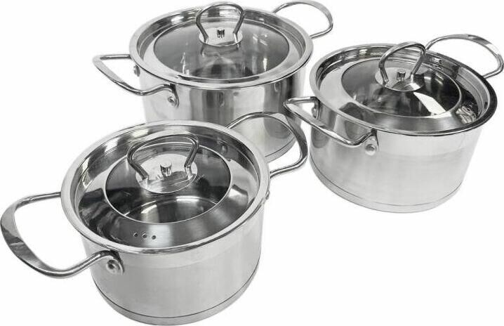 Набор посуды 6 предметов Кастрюля 2,1 л Диаметр 16 см Кастрюля 3 л Диаметр 18 см Кастрюля 4 л Диаметр 20 см Высококачественная нержавеющая сталь Жаропрочные стеклянные крышки с паровыпуском 5-ти слойное капсульное дно Удобные термостойкие клепаные ручки Зеркальная+матовая полировка Пригодна для всех видов плит