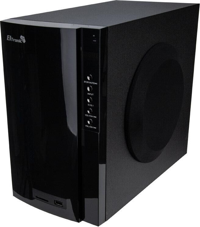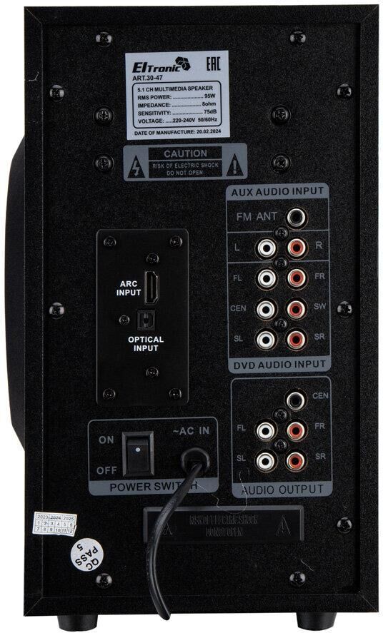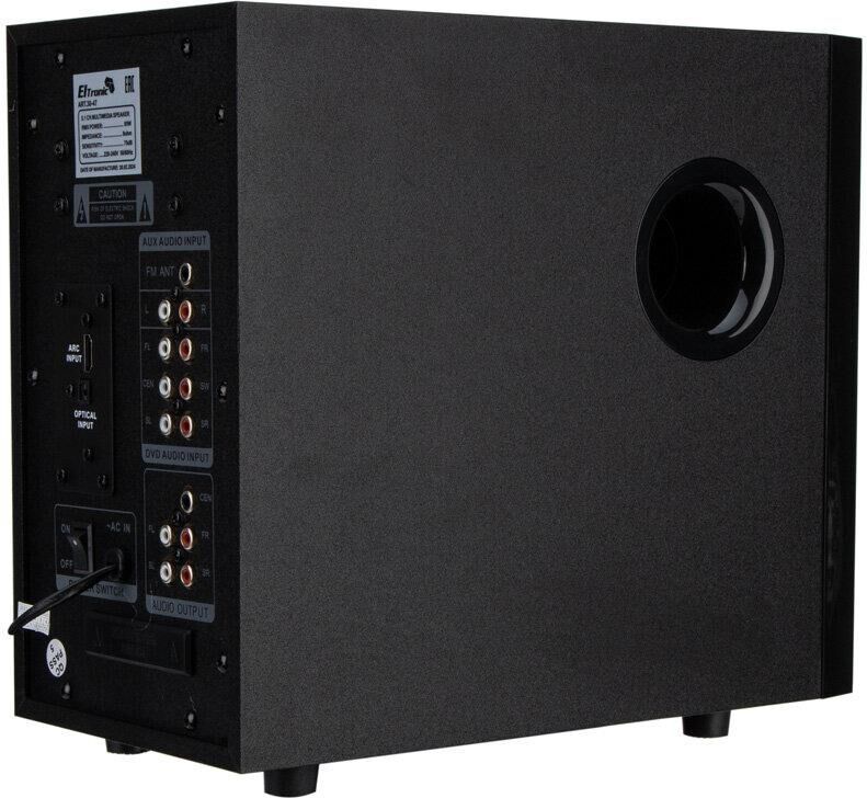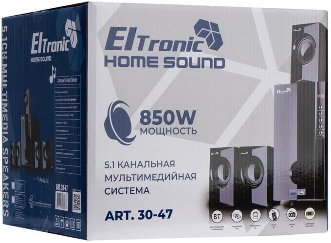 "Акустическая система 5.1 ELTRONIC HOME SOUND; ; Режимы воспроизведения:; - Bluetooth; - Внешний накопитель; - Aux, HDMI ARC, Optical; - FM; ; Мощность:; - RMS 85 Ватт; - PMPO 850 Ватт; ; Питание:; - Сеть 220V; ; Разъемы:; - USB; - SD; - Auх тюлпан; - ARC in; - Optical in; ; Комплектация:; - Комплект соединительных проводов; - Пульт Д/У; - Инструкция на Русском языке; ; Размер упаковки:; Ширина - 38 см; Высота - 32 см; Глубина - 33 см; ; Дополнительно:; Встроенный MP3 плеер; Управление плеером прямо на колонке; Led дисплей; Сенсорное управление"