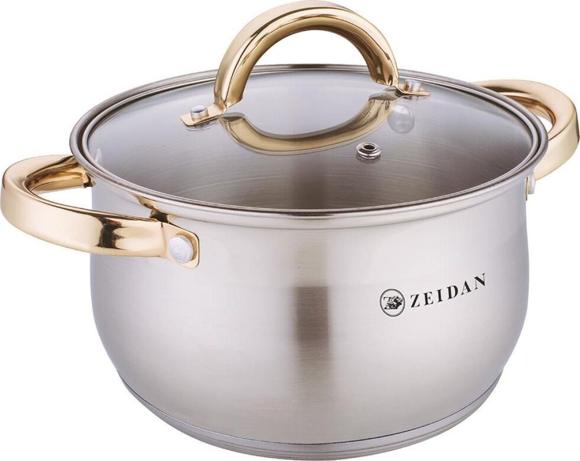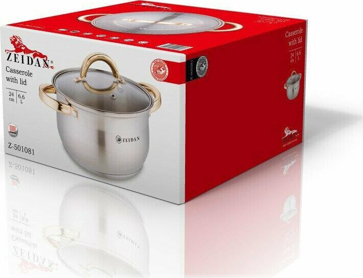 Кастрюля ZEIDAN Z-501081 6,6 л с крышкой, Кастрюля со стеклянной крышкой - 6,6 Л (Ø24 см), нержавеющая сталь, 5-ти СТЕПОВОЕ КАПСУЛИРОВАННОЕ ИНДУКЦИОННОЕ ДНО, крышка - стекло, ручки на корпусе и крышке "ПОД ЗОЛОТО", комбинированная полировка снаружи, матовая полировка внутри. Подарочная упаковка.