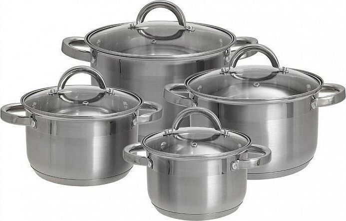 Параметры В наборе 8 предметов: кастрюля с крышкой 16×10,5см; 2,2л кастрюля с крышкой 18×11,5см; 3 л кастрюля с крышкой 20×12,5см; 4 л кастрюля с крышкой 22×13,5см; 5,2л Толщина стали 0,5 мм Описание Набор кастрюль из высококачественной нержавеющей стали со стеклянными крышками Серия: Standart Термосберегающее дно: пятислойное дно с повышенной термоотдачей Специальная форма, исключающая скопление остатков пищи и жира Обод, препятствующий переливанию жидкостей через край Быстрый нагрев пищи, длительное удержание тепла Минимальные потери минеральных веществ, витаминов и вкусовых качеств Подходит для использования на всех типах кухонных плит, включая индукционные Подходит для мытья в посудомоечной машине Упаковка: цветная коробка с ручками