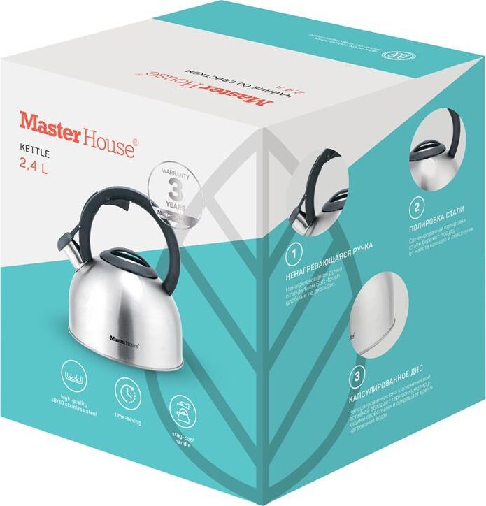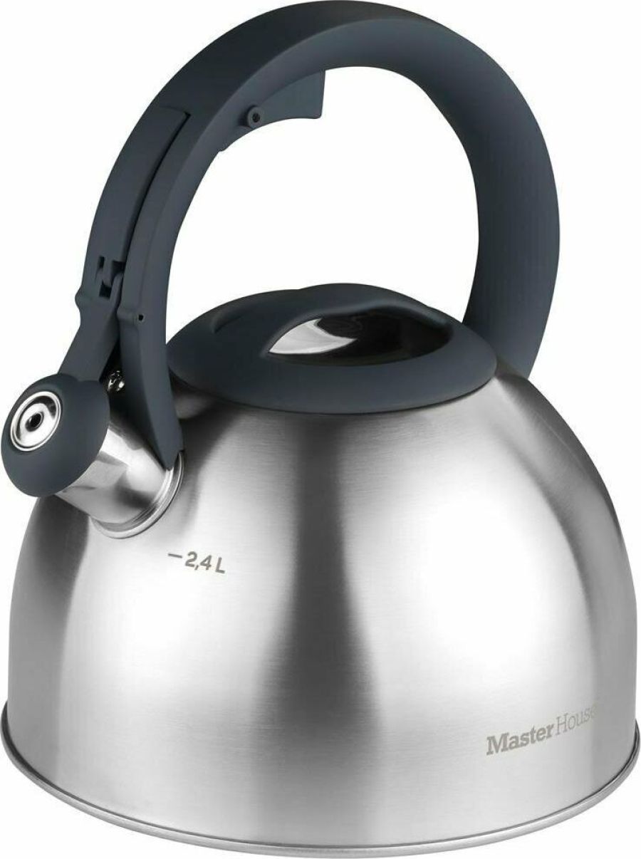 Чайник из со свистком 2,4 литра. Нержавеющая сталь 304 (18/10). Цвет сталь, ручка графит. В ИНД, КОРОБКЕ В25хШ22хД21 вес 0,78кг БЕЗ КОРОБКИ Высота 24,3см ШиринаХДлина 21,5х19,5см Вес без коробки 0,6кг