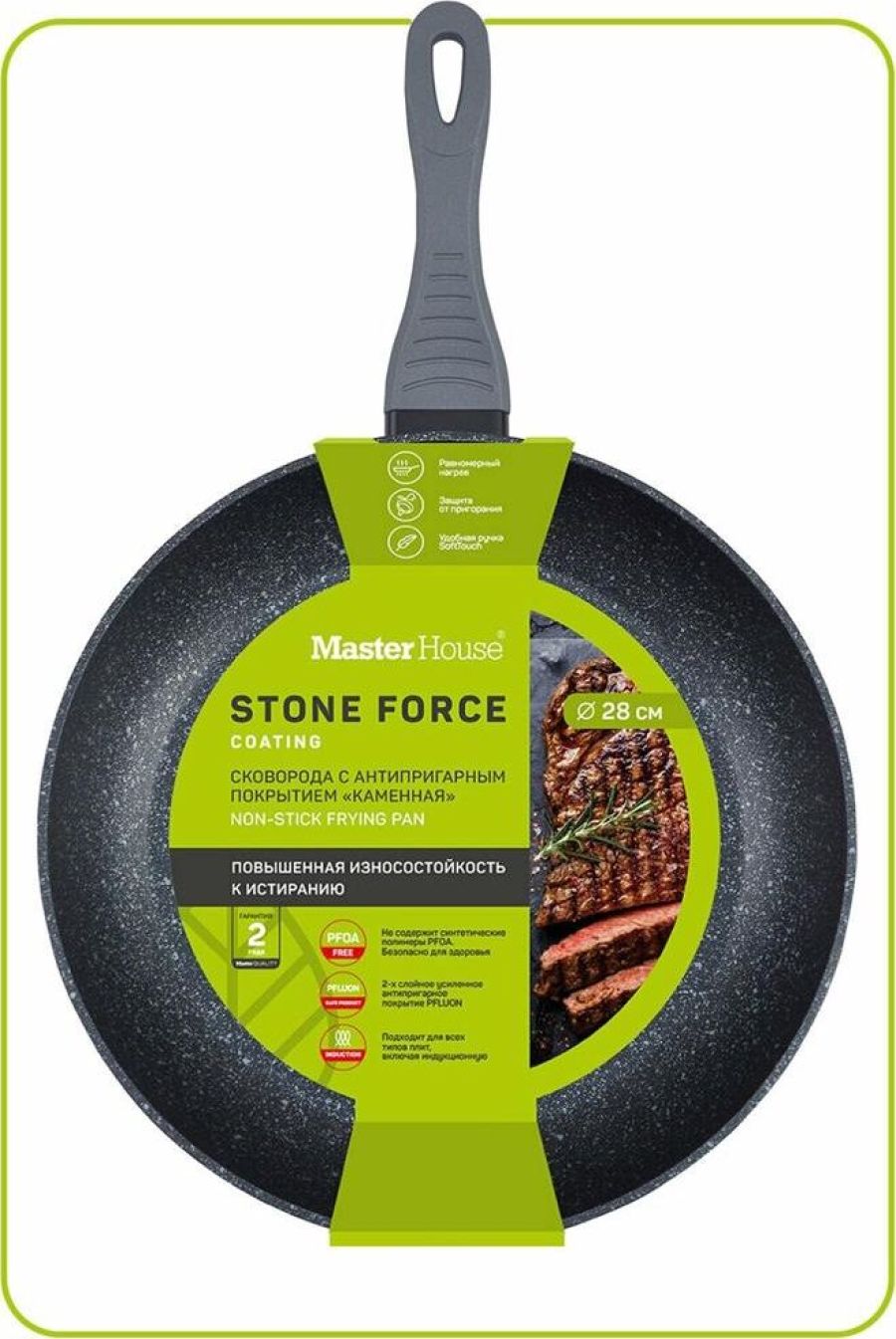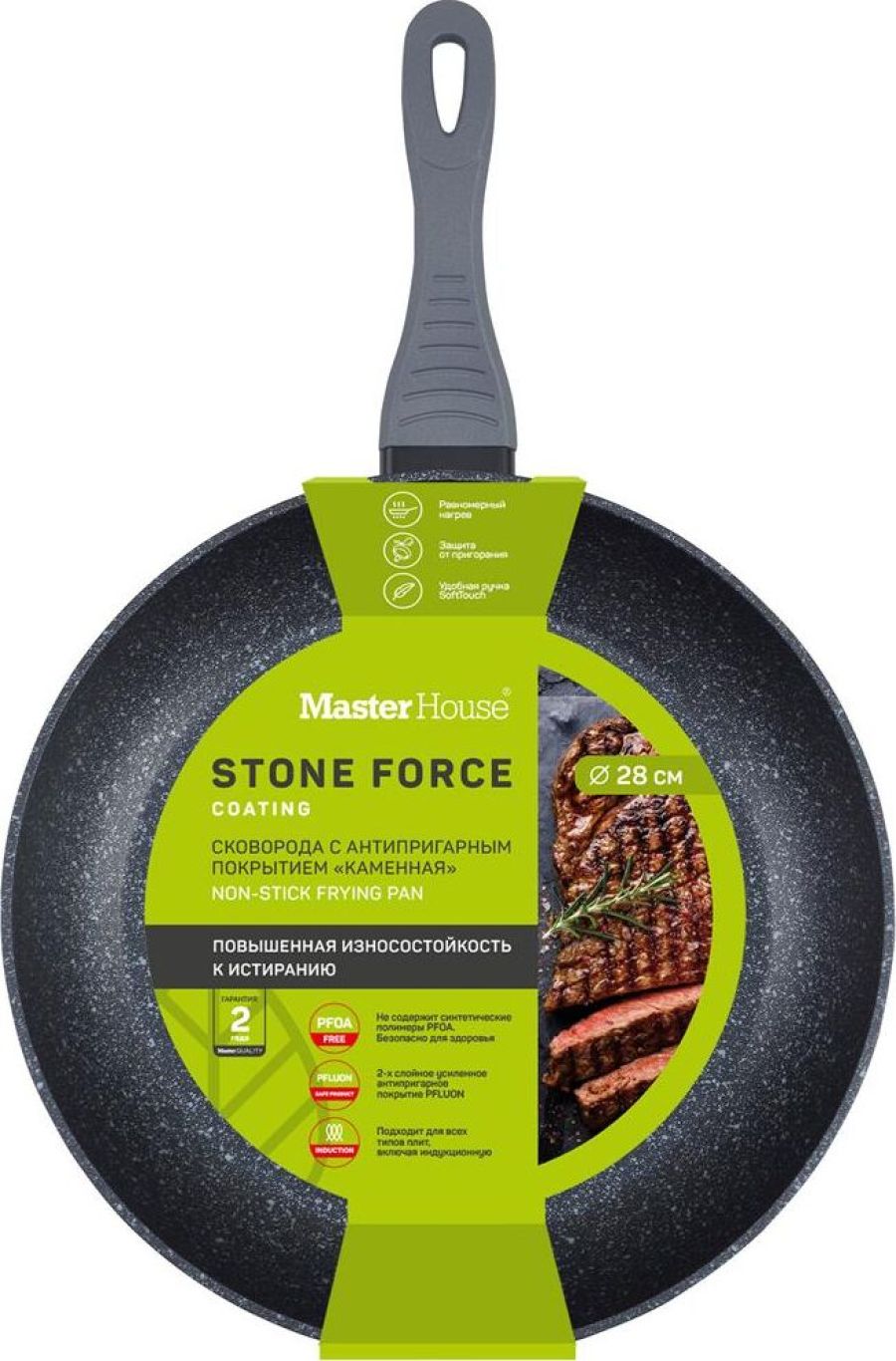 Сковорода. Кованый алюминий. Бакелитовая ручка с мягким напылением. Двухслойное антипригарное усиленное покрытие, стандарт Pfluon. Толщина покрытия 25-30мкр. Выдерживает более 3000 циклов на истирание. Диаметр по верху (крышка): 28см, высота бортика 53мм, толщина дна 3 мм, Подходит для всех видов плит, в том числе для индукционной.