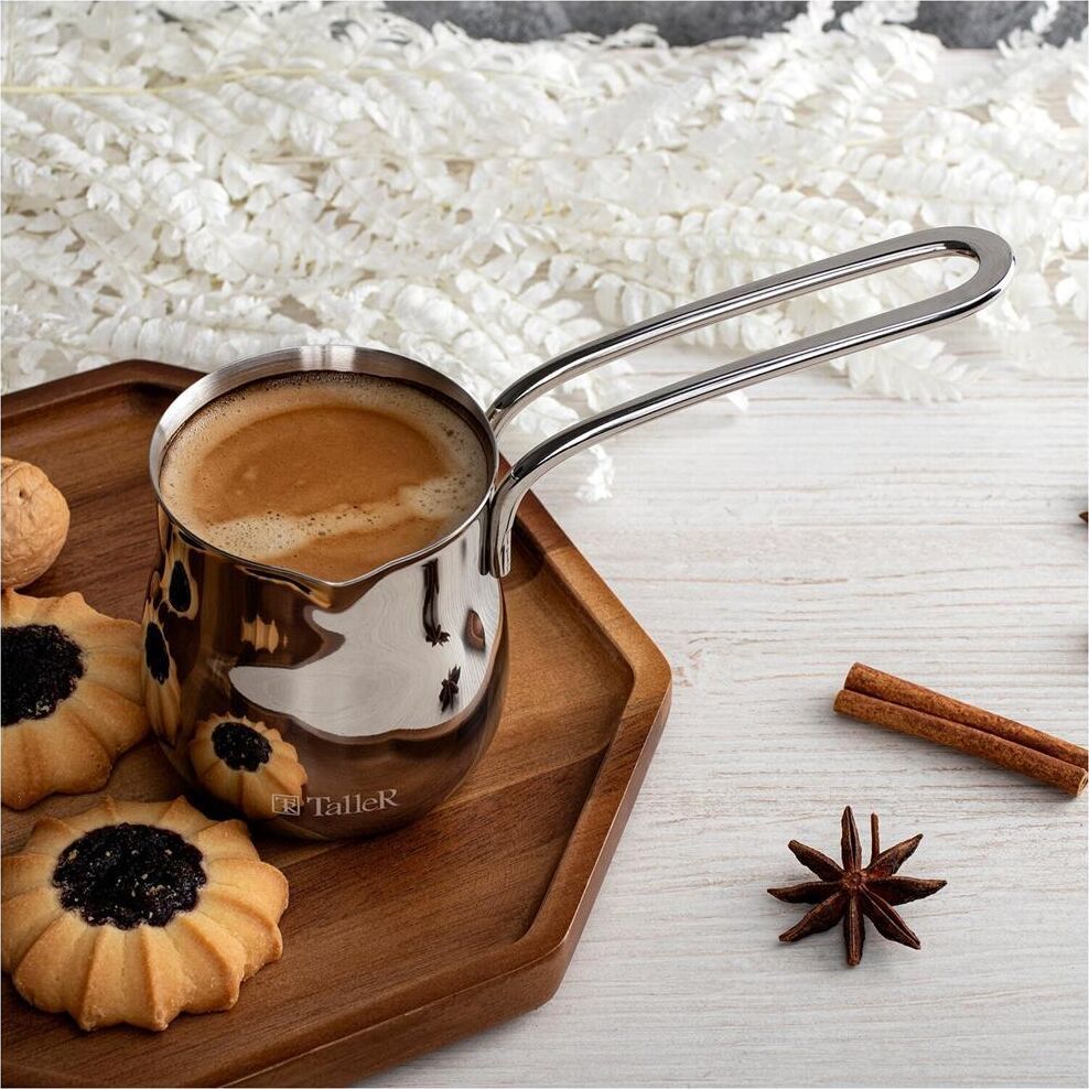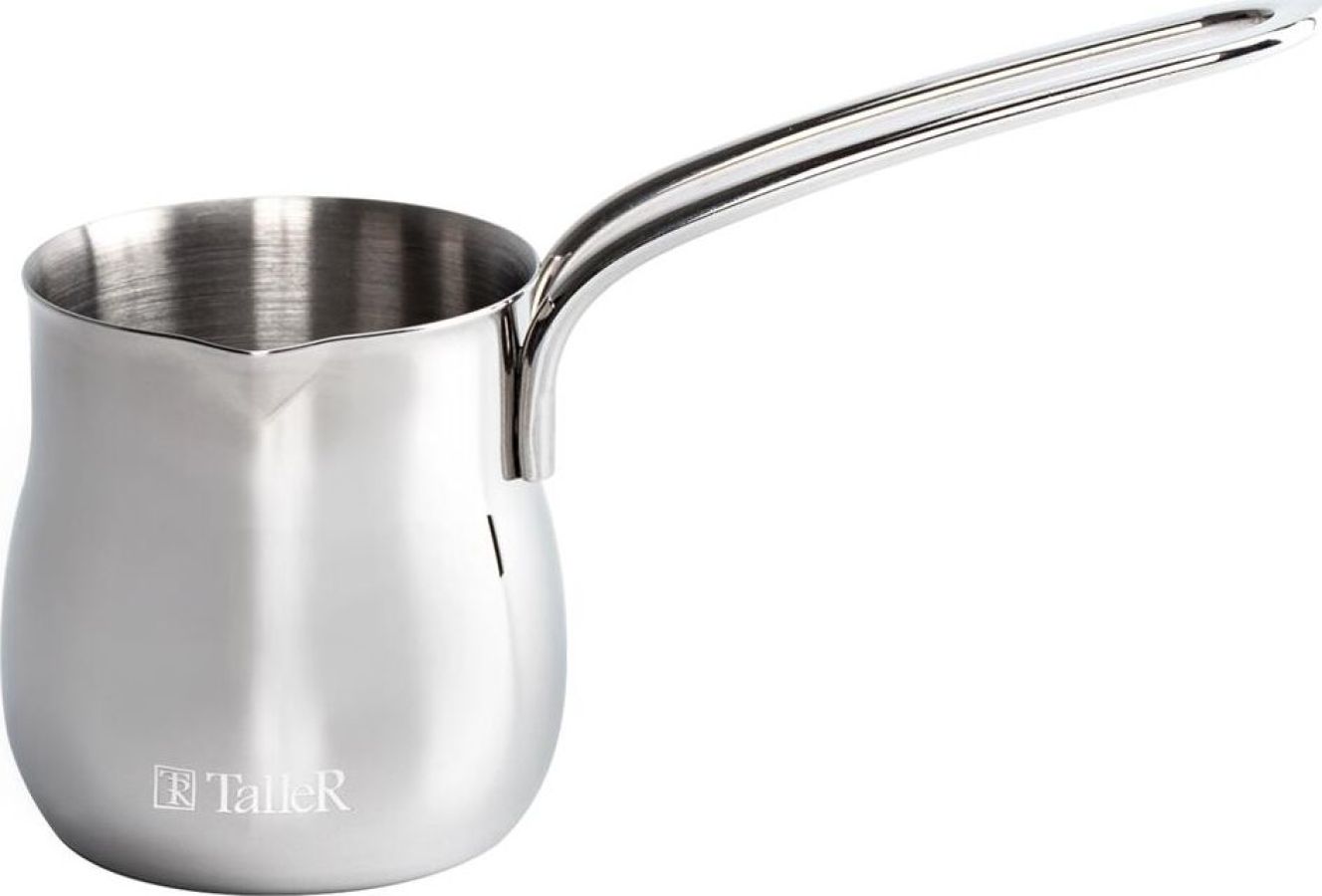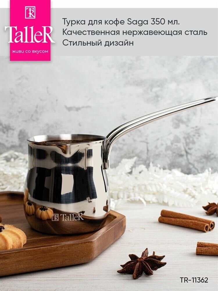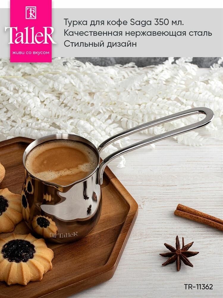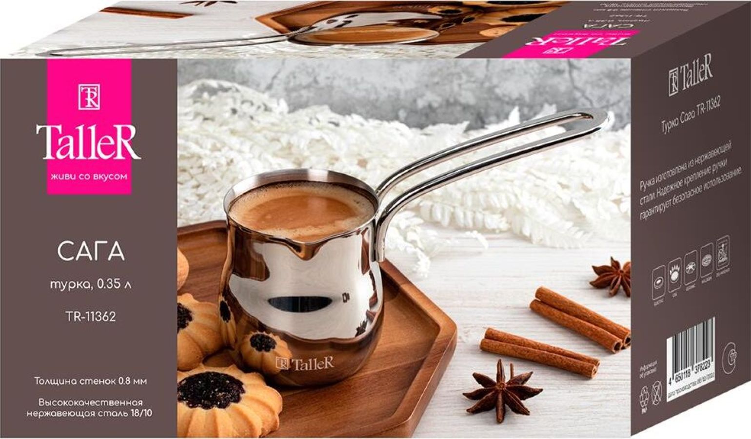 Турка 0,35 л Сага Материал: нержавеющая сталь, толщина стенки 0,8 мм Рекомендации: подходит для всех типов плит, кроме индукционных. Пригодна для мойки в посудомоечной машине Упаковка - цветная коробка