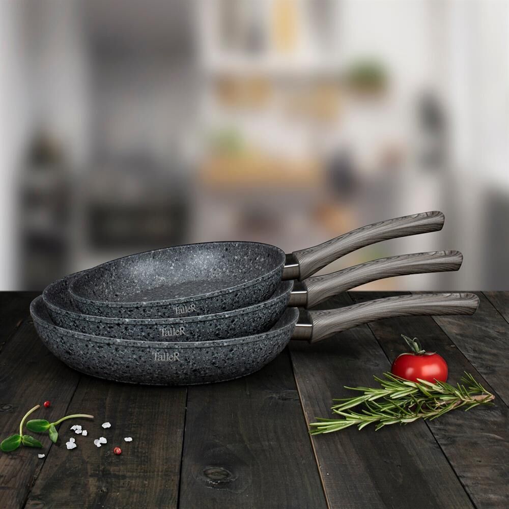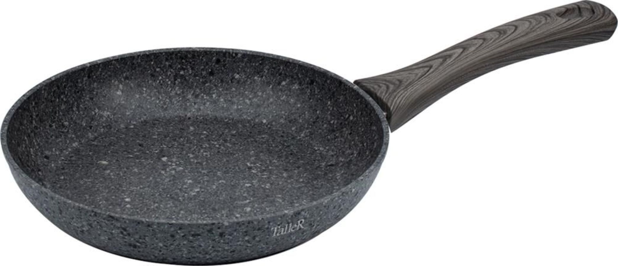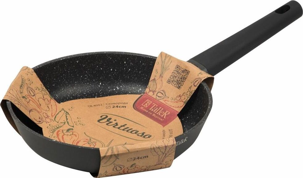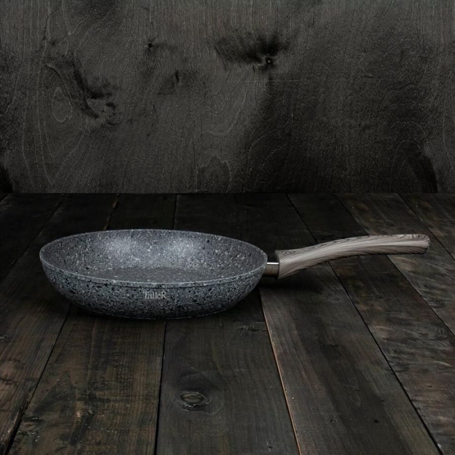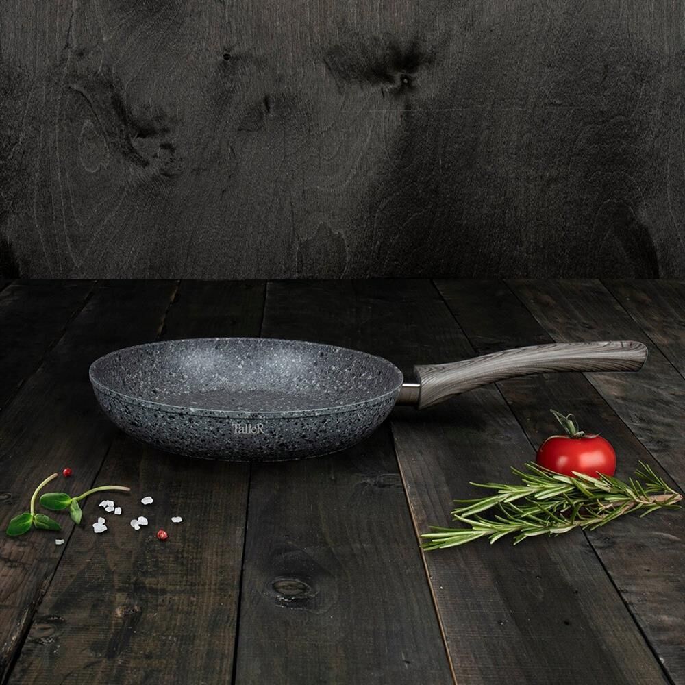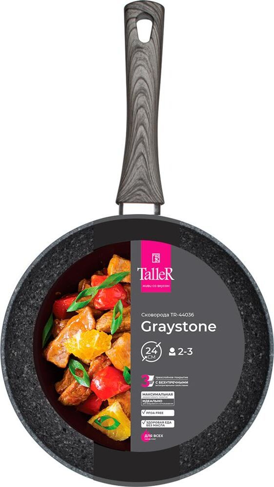 Сковорода "Graystone", диаметр 24 см. без крышки, Материал: кованый алюминий с антипригарным покрытием Толщина дна 3.3 мм, толщина стенки 2,5 мм, высота сковороды 4,8 см, внешний диаметр дна 19,0 см Бакелитовая ручка с покрытием "soft touch". Рекомендаци