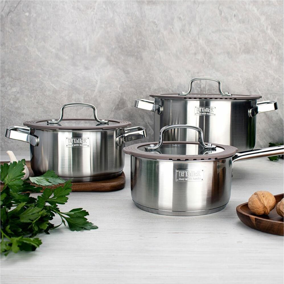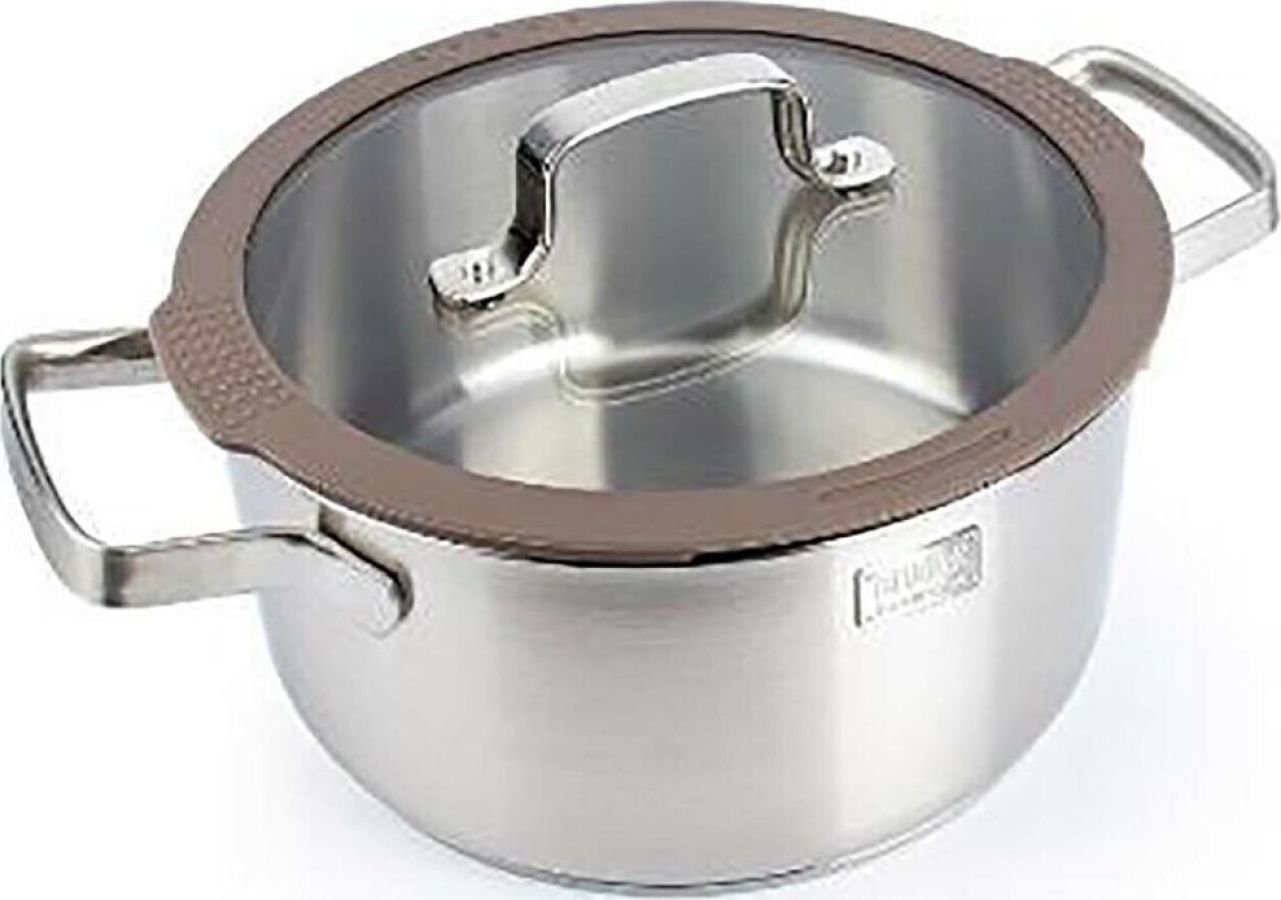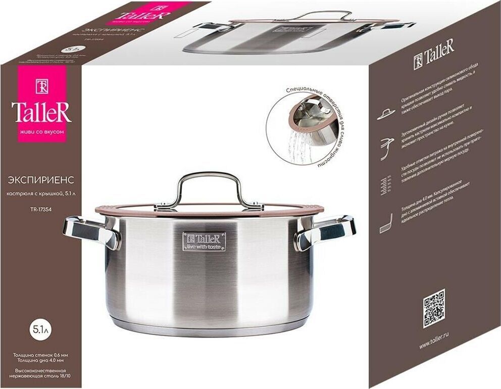 Кастрюля Experience с крышкой, 5,1 л Материал: нержавеющая сталь 18/10 Комбинированная крышка из закаленного стекла с силиконовым ободом оригинальной конструкции , цвет крышки 409С Удобные отметки литража на внутренней поверхности посуды Капсулированное д