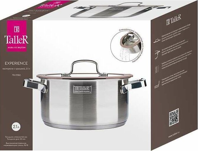 Кастрюля Experience с крышкой, 2,1 л Материал: нержавеющая сталь 18/10 Комбинированная крышка из закаленного стекла с силиконовым ободом оригинальной конструкции , цвет крышки 409С Удобные отметки литража на внутренней поверхности посуды Капсулированное