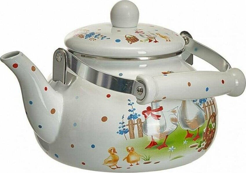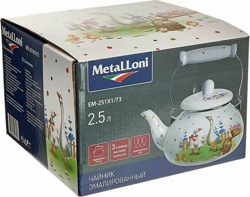 Параметры Объем 2,5 л Описание Чайник эмалированный, без свистка, с керамической ручкой Трехслойное внутреннее и внешнее эмалевое покрытие, устойчивое к воздействию пищевых кислот Эргономичная подвижная керамическая ручка Зачерненное дно с повышенной термоотдачей Может быть использован на всех типах кухонных плит: электрических, газовых, керамических, индукционных Подходит для мытья в посудомоечной машине Упаковка: цветная коробка