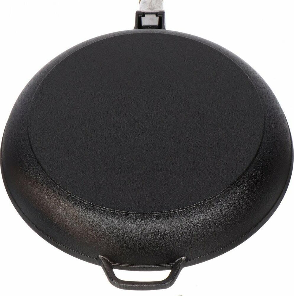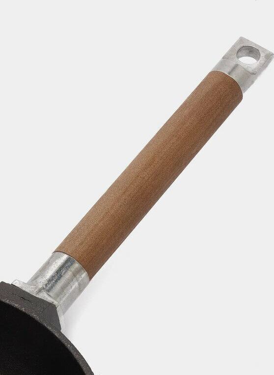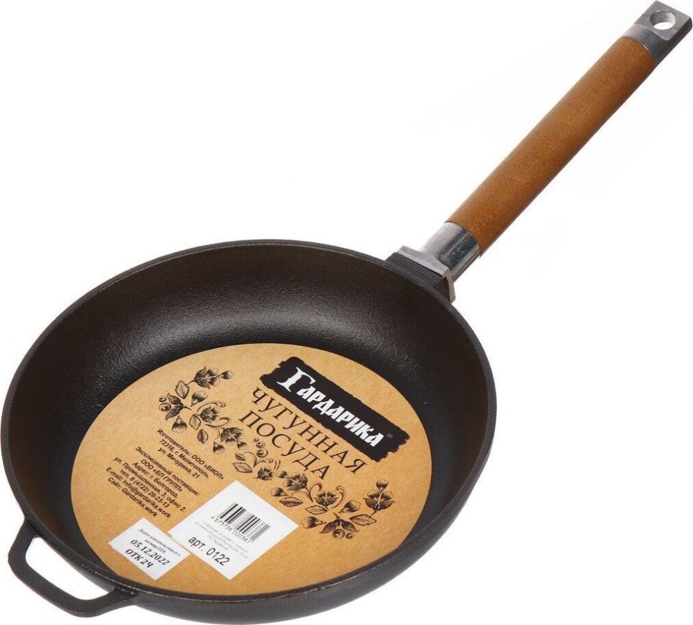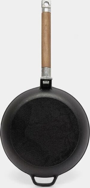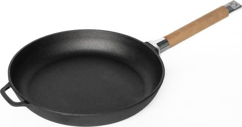 Сковорода отличается надежностью, прочностью и долговечностью эксплуатации. Ее можно использовать на всех видах нагревательных поверхностей, включая газовые и индукционные плиты, а также на открытом огне. Модель диаметром 22 см выполнена из чугуна, обладающего высокой теплопроводностью, что значительно ускоряет кулинарные процессы и делает блюда особенно вкусными. Устойчивое к появлению царапин внутреннее покрытие позволяет применять во время приготовления пищи металлические лопатки и ложки для переворачивания и перемешивания ингредиентов, не опасаясь повредить поверхность. Особенность конструкции сковороды заключается в изготовленной из дерева съемной ручке, которая оснащена петлей, позволяющей удобно хранить изделие в подвешенном виде. Ручка легко снимается, благодаря чему модель подходит для создания блюд в духовом шкафу и существенно экономит место в холодильнике. Характеристики: Материал: чугун; Материал ручки: дерево, алюминий; Диаметр: 22 см; Цвет: черный, коричневый; Съемная ручка: да;