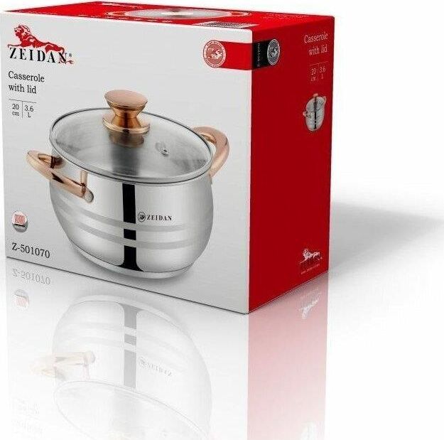 Кастрюля ZEIDAN Z-501070 3,6 л с крышкой, Кастрюля со стеклянной крышкой - 3,6 Л (Ø20 см), нержавеющая сталь, 3-x СЛОЙНОЕ КАПСУЛИРОВАННОЕ ИНДУКЦИОННОЕ ДНО, крышка - стекло, ручки на корпусе и крышке "ПОД ЗОЛОТО", комбинированная полировка снаружи, матовая полировка внутри. Подарочная упаковка.