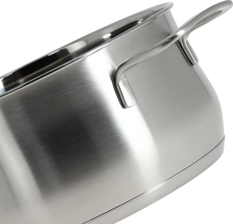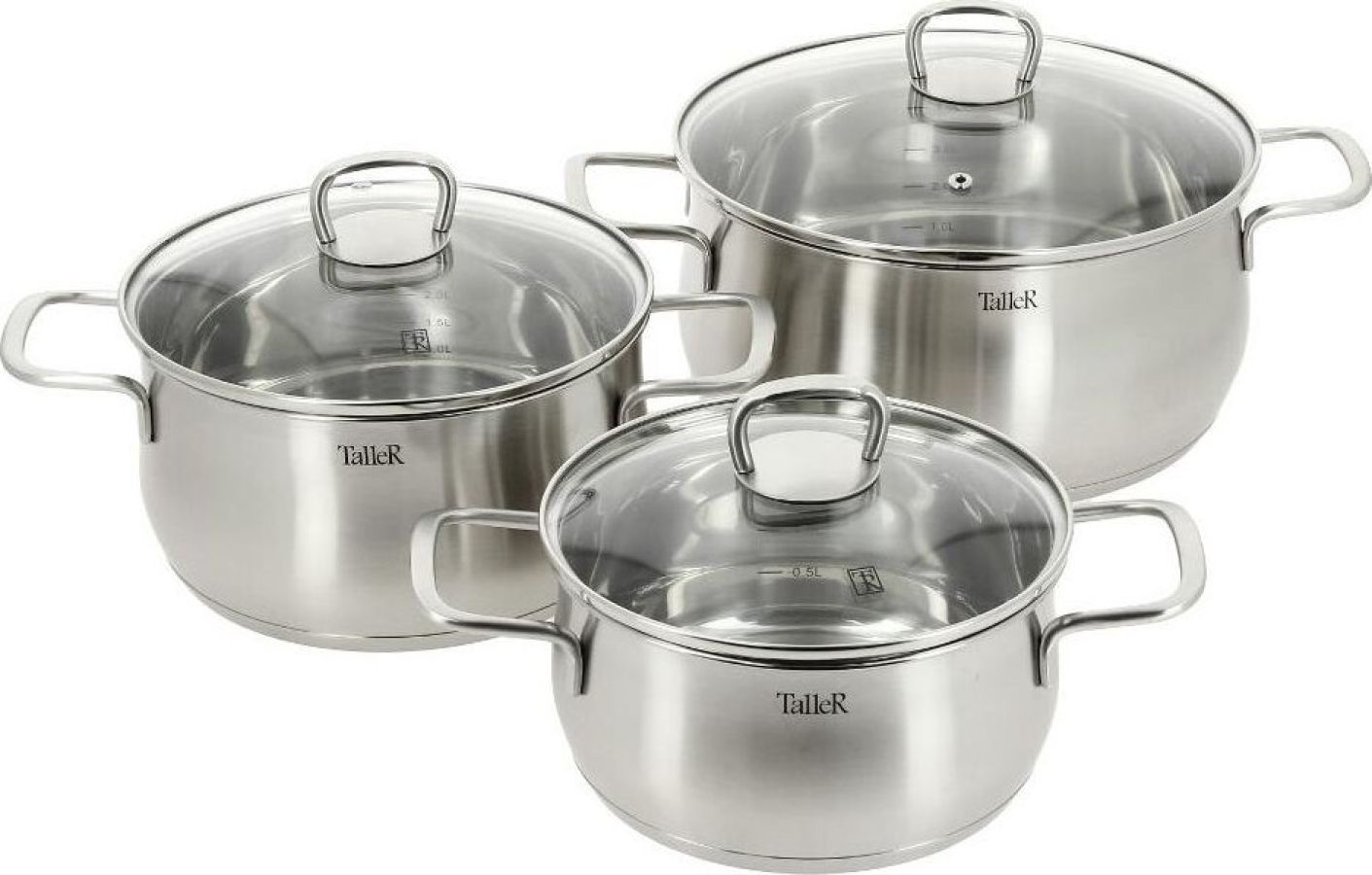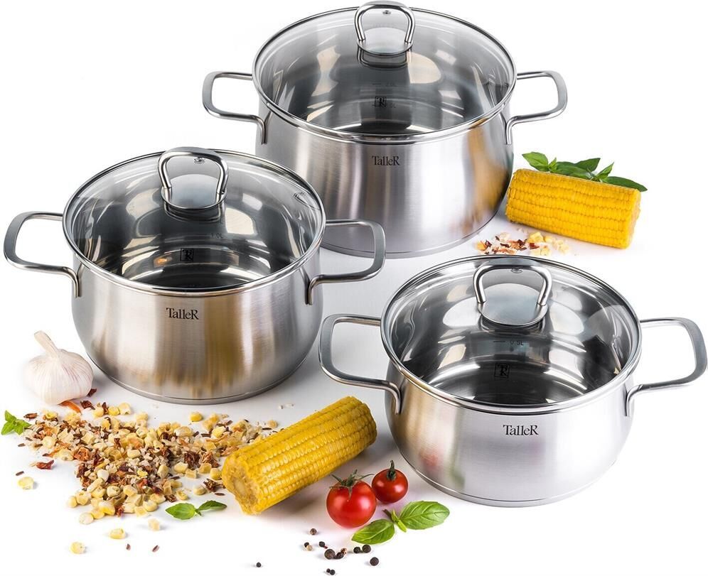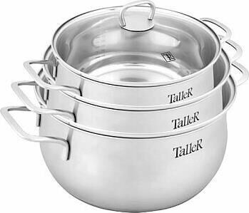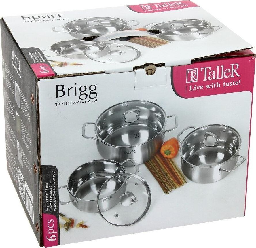 Набор посуды "Бригг", 6 пр Состав: 18*9 кастрюля с крышкой (2.2L), 20*10.5 кастрюля с крышкой (3.2L), 24*11.5 кастрюля с крышкой (5,2L) Толщина стенки — 0,6 мм, толщина дна — 2,8 мм. Полировка матовая снаружи, зеркальная внутри. Крышки из жаропрочного