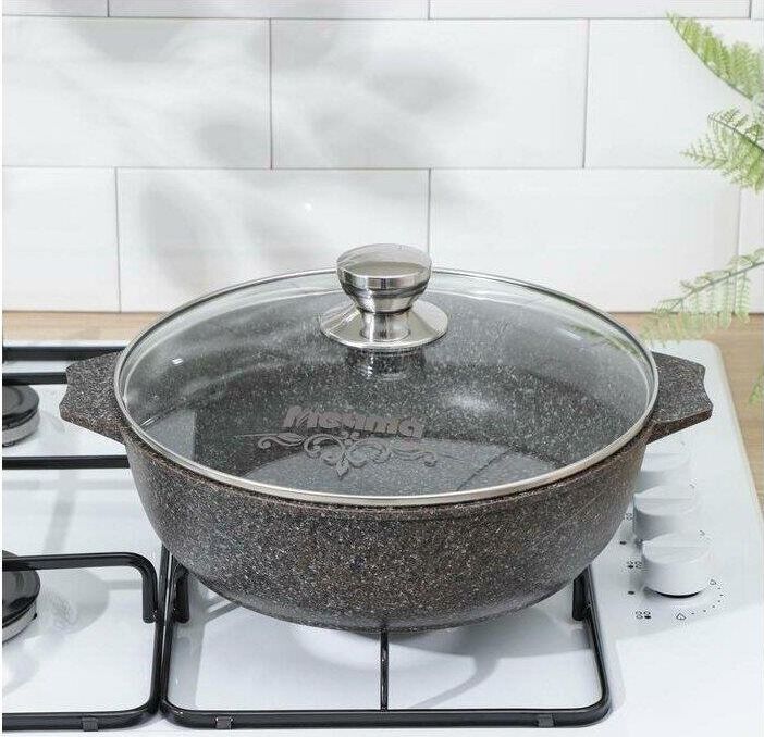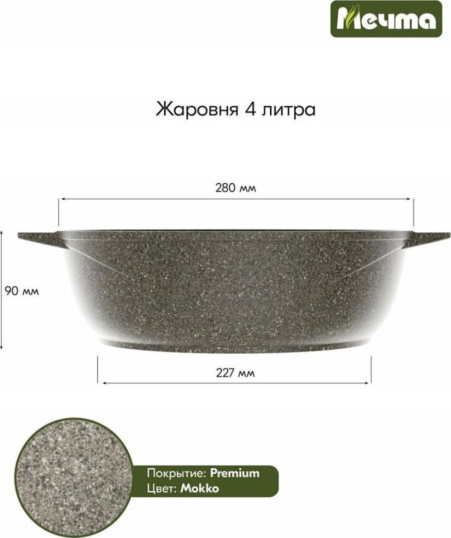 Жаровня 4л с антипригарным покрытием и стеклянной крышкой серии "Premium" цвет mokko. Подходит для всех типов плит, кроме индукционных. Можно использовать в посудомоечной машине. Можно использовать в духовке отдельно без крышки.