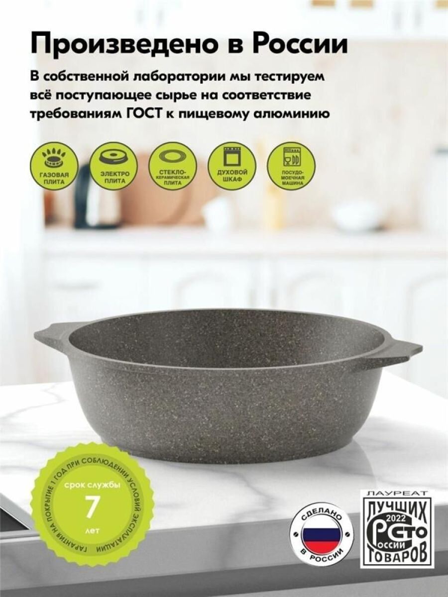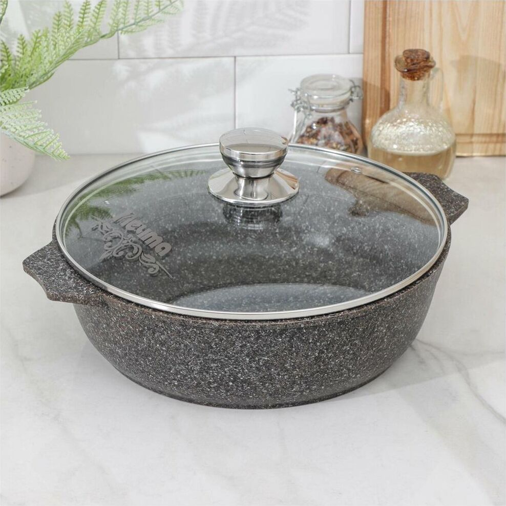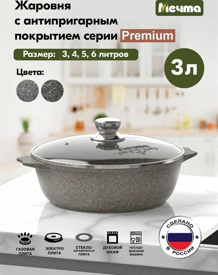Жаровня 3л с антипригарным покрытием и стеклянной крышкой серии "Premium" цвет mokko. Подходит для всех типов плит, кроме индукционных. Можно использовать в посудомоечной машине. Можно использовать в духовке отдельно без крышки.