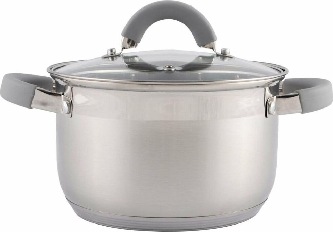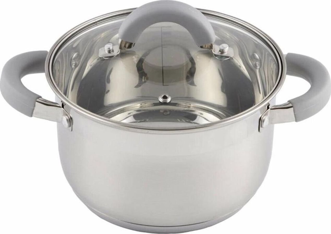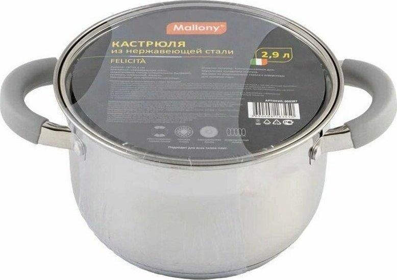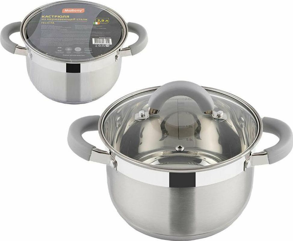 Кастрюля Felicità, объем 2,9 л, из нерж стали с крышкой из жаропрочного стекла, размер 18*11,5 см Материал: нерж сталь № 201, жаропрочное стекло, силикон, алюминий, нерж сталь № 430, железо. Размер: 18*11,5 см/Объем: 2,9 л. Толщина стенок — 0,5 мм, 5-слойное капсулированное дно/толщина дна 3,5 мм (0,5 мм нерж сталь 201+0,5 мм алюминий + 1 мм железо +0,5 мм алюминий + 0,5 мм 430 сталь). Подходит для всех типов плит. Зеркальная полировка внутри. Отметки литража. Снаружи — смешанная полировка корпуса (матовая, в верхней части зеркальная). Крышка С-типа из жаропрочного стекла с отверстием для выпуска пара. Полые ручки из нерж стали с покрытием из силикона. Инд упаковка: термоусадка + цветной круглый вкладыш. Диаметр дна: 14,5 см Диаметр крышки: 18,5 см