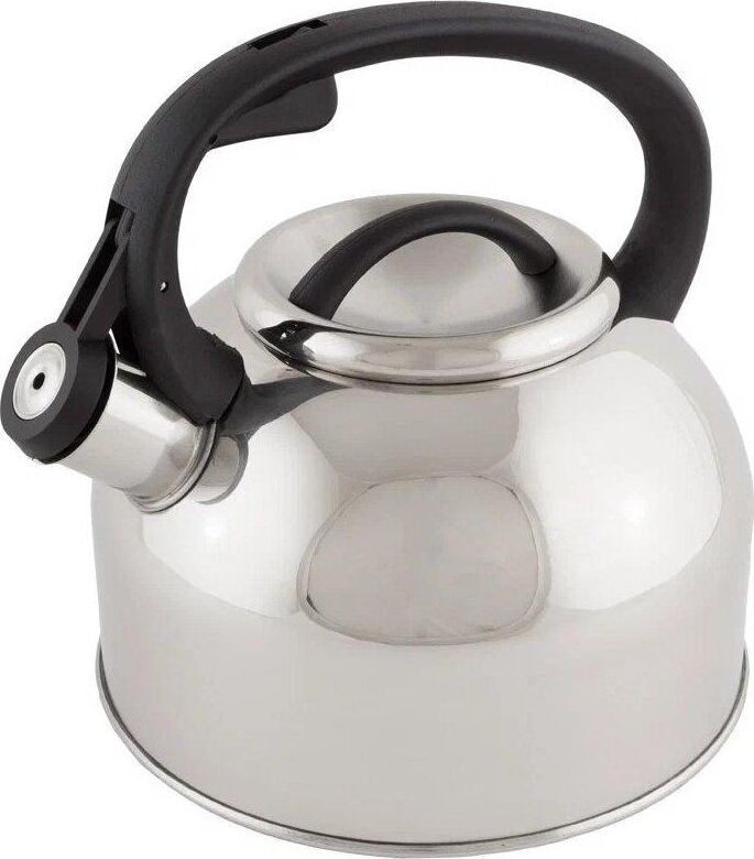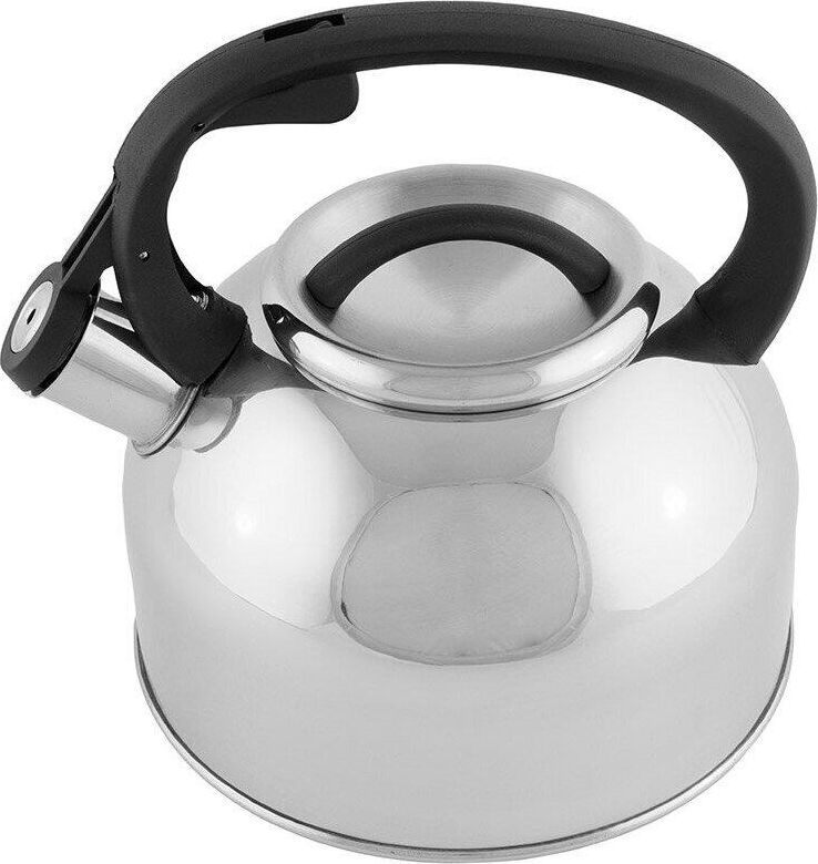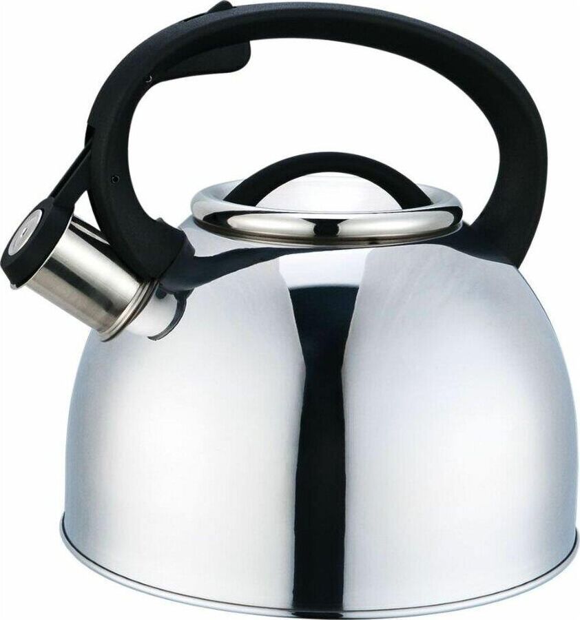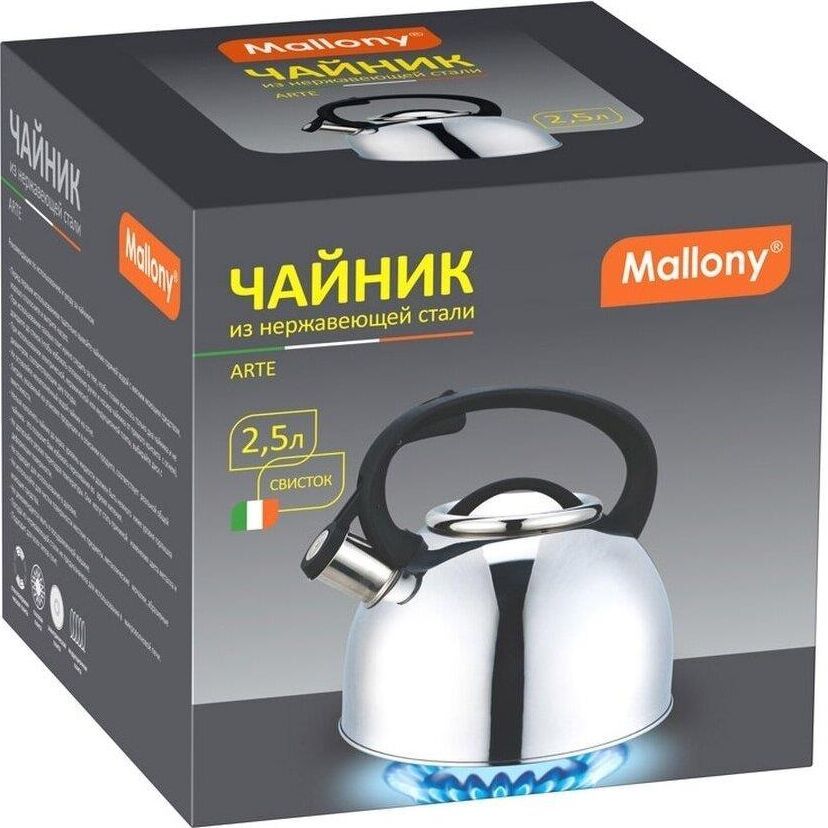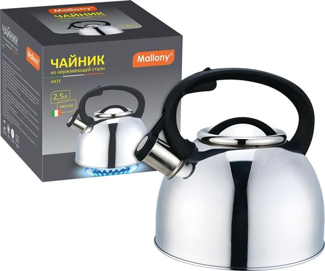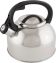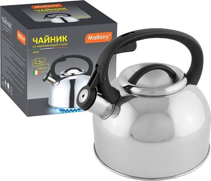 Чайник из нержавеющей стали # 201 со свистком, с крышкой, с ручкой из нейлона, матовый внутри/зеркальная полировка снаружи. дно — одинарное, подходит для всех типов плит, толщина стали — 0,3 мм, литраж — 2,5 литра, упаковка — цветная коробка. Название модели — "Arte" Материалы: нержавеющая сталь, нейлон.