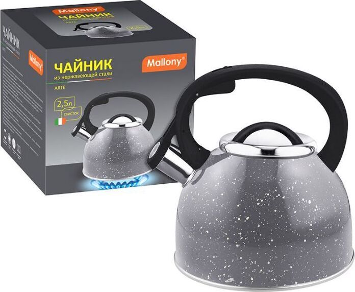Чайник из нержавеющей стали # 201 со свистком, с крышкой, с ручкой из нейлона, матовый внутри/окрашенный под мрамор — снаружи (серый с белыми точками) матовая окрашенная поверхность корпуса дно — одинарное, подходит для всех типов плит, толщина стали — 0,3 мм, литраж — 2,5 литра, упаковка — цветная коробка. Название модели — "Arte" Материалы: нерж сталь № 201, нейлон.