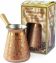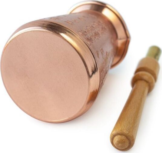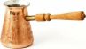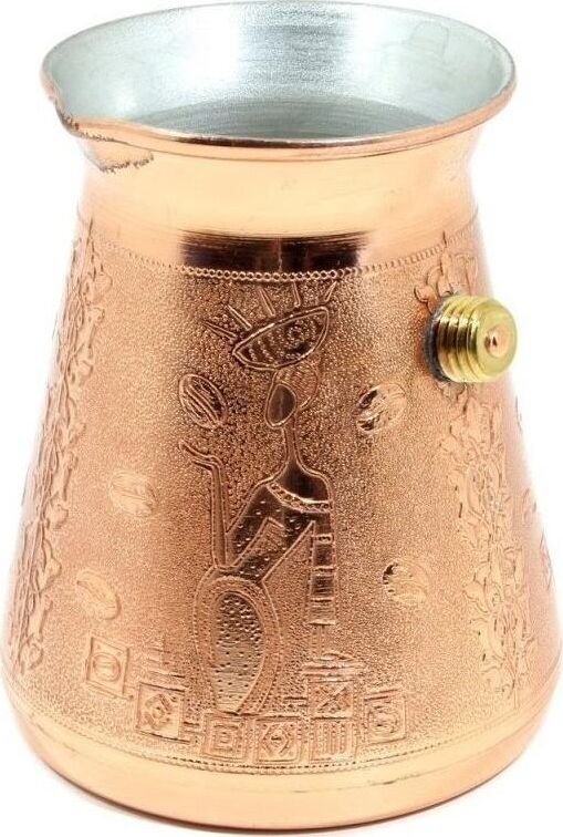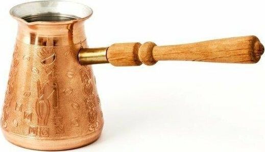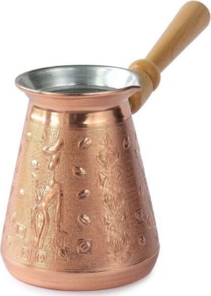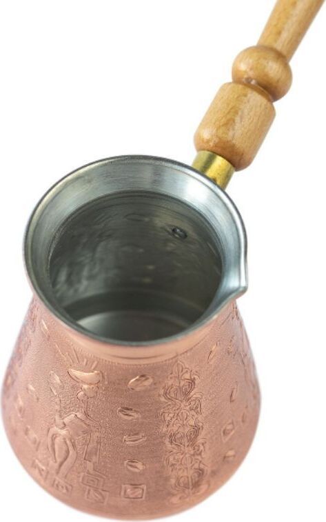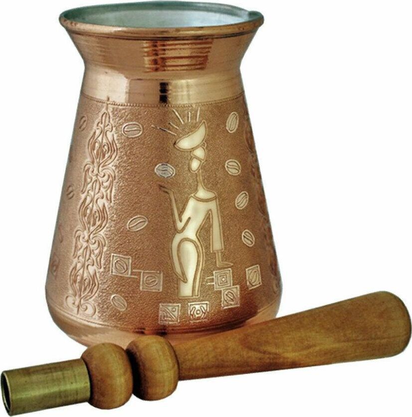 Турка изготовлена из меди, прекрасно подходит для приготовления настоящего кофе на плите. Внешняя поверхность имеет декоративное тиснение, что придает изделию оригинальный внешний вид. Внутренняя сторона покрыта пищевым оловом. Изделие оснащено небольшим носиком и удобной не нагревающейся деревянной ручкой с петелькой для подвешивания. Надежное крепление ручки гарантирует безопасное использование.
