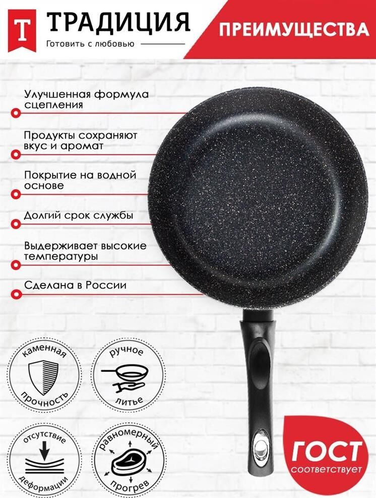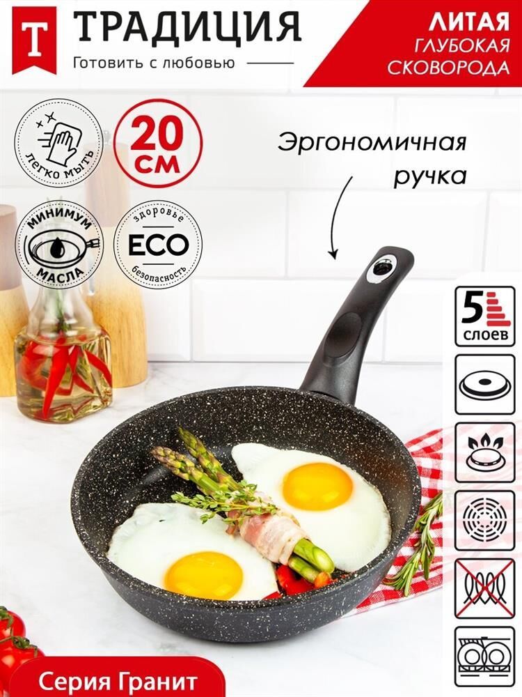 Объем, л./размер, см: 20 см Материал: литой алюминий Коллекция/серия: Гранит Толщина дна: 6 Толщина стенок: 3.8 Источник тепла: Все виды плит, кроме индукционной Тип упаковки: цветной рукав Внутреннее покрытие: антипригарное покрытие Greblon NewTec C2+ Внешнее покрытие: антипригарное покрытие Greblon NewTec C2+